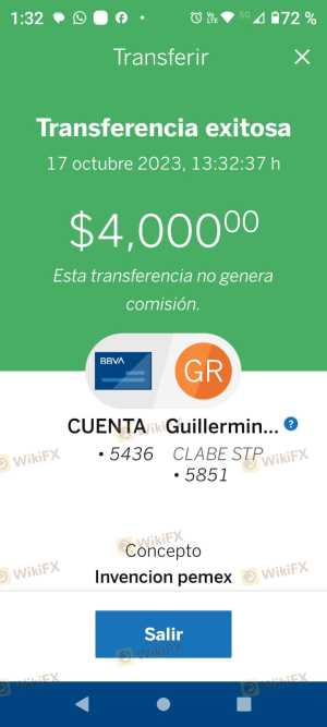 مساء الخير، اسمي غييرمينا رودريغيز تشافيز. أنا مكسيكي وأعيش في ولاية موريلوس. في يوم الثلاثاء 17 أكتوبر 2023، تلقيت اتصالاً يدعوني للاستثمار في منصة بيميكس وطلب مني إيداع مبلغ 4000 دولار. 00 في Banco de Destino Stp، رمز الحساب: 646010387801635851. وطلبوا مني أن أضع اسمي كمستفيد، مع مفهوم الدفع: inversión pemex بمجرد أن فعلت ذلك، أصبحت متشككًا للغاية وبدأت في التحقيق. رأيت العديد من عمليات الاحتيال بهذا الاسم ( FXTRATEGY ). لقد اتصلوا بي، بعد الإيداع، طلبوا مني أن أرسل لهم إثبات عنواني وهويتي للتحقق من صحتهم وطلبوا مني أيضًا تنزيل تطبيق يسمى Anydesk أو تطبيق آخر يسمى TeamViewer، أعلم أن هذه التطبيقات تهدف إلى رؤية جميع المعلومات الموجودة على هاتفك أو جهاز الكمبيوتر الخاص بك، لذلك لم أفعل ذلك، كنت خائفًا. ولهذا السبب أتوجه إليك لمعرفة ما إذا كان بإمكانك مساعدتي في استرداد استثماري، شكرًا جزيلاً لك، وأرفق بعض الأدلة وإثبات الإيداع.
