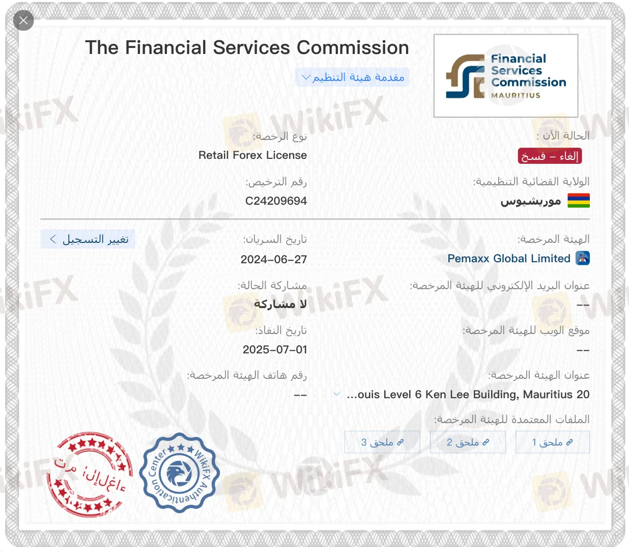الركيزة الأساسية للثقة لأي مقدم خدمات مالية هي وجود ترخيص تنظيمي ساري المفعول. في السابق، كانت Pemaxx Global Limited تحمل فقط ترخيص “تاجر استثمار” من لجنة الخدمات المالية (FSC) في موريشيوس (رقم الترخيص C24209694).