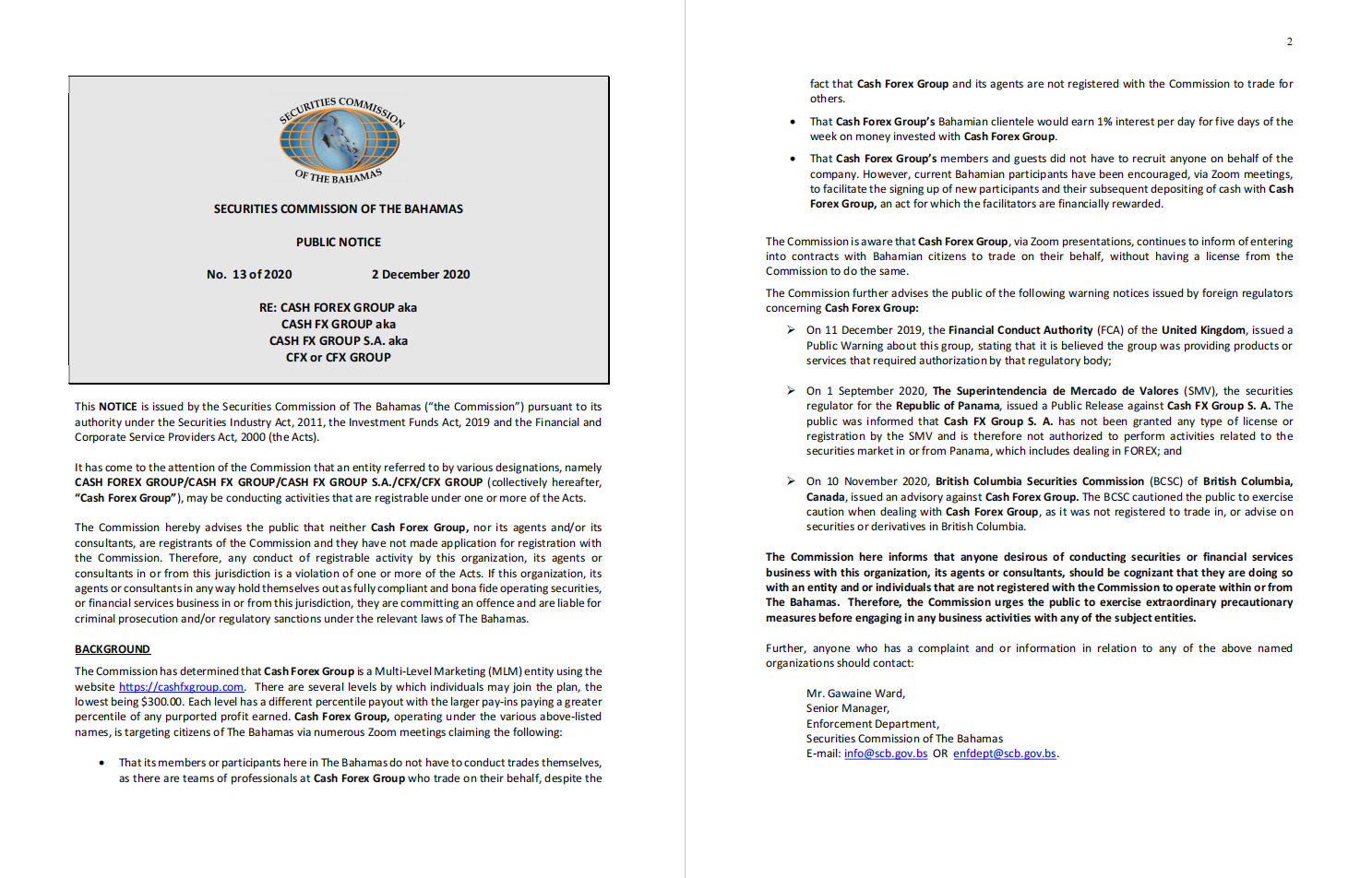 لجنة الأوراق المالية لإشعار الباهاما العام رقم 13 لعام 2020 2 ديسمبر 2020 RE: CASH FOREX GROUP ويعرف أيضًا باسم CASH FX GROUP ويعرف أيضًا باسم CASH FX GROUP SA ويعرف أيضًا باسم CFX أو CFX GROUP