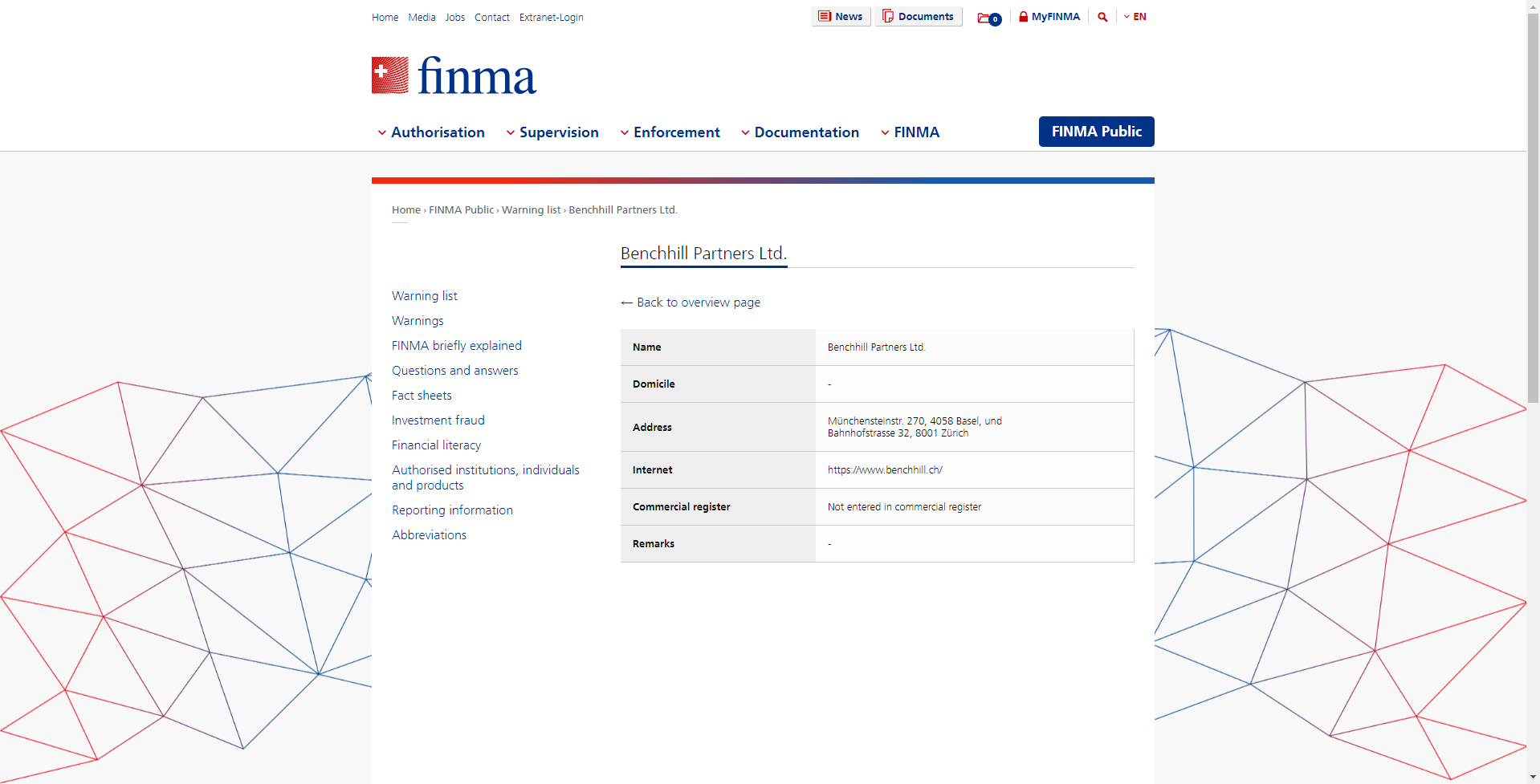 Benchhillاسم الشركاء المحدودة Benchhill الشركاء المحدودة محل الإقامة - العنوان münchensteinstr. 270، 4058 Basel، and Bahnhofstrasse 32، 8001 Zurich Internet https: // www. Benchhill .ch / سجل تجاري لم يتم إدخاله في ملاحظات السجل التجاري -