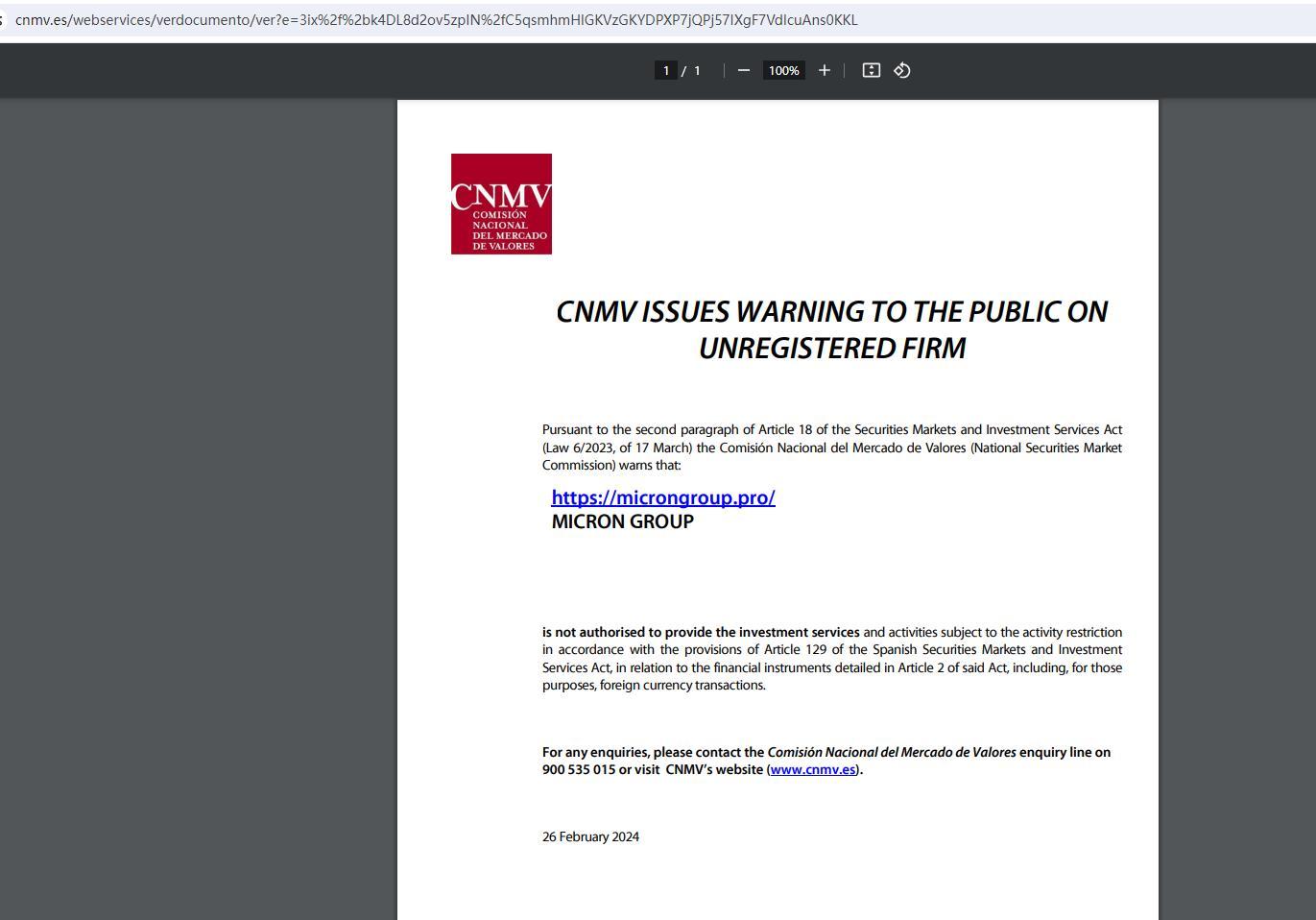 تصدر CNMV تحذيرًا للجمهور بشأن شركة غير مسجلة وفقًا للفقرة الثانية من المادة 18 من قانون أسواق الأوراق المالية وخدمات الاستثمار (القانون رقم 6/2023، الصادر في 17 مارس) وتحذر اللجنة الوطنية لسوق الأوراق المالية (اللجنة الوطنية لسوق الأوراق المالية) من ذلك : https://microngroup.pro/ Micron Group غير مصرح له بتقديم الخدمات والأنشطة الاستثمارية الخاضعة لقيود النشاط وفقًا لأحكام المادة 129 من قانون أسواق الأوراق المالية وخدمات الاستثمار الإسباني، فيما يتعلق بالأدوات المالية المفصلة في المادة 2 من القانون المذكور، بما في ذلك، لتلك الأغراض، المعاملات بالعملة الأجنبية. لأية استفسارات، يرجى الاتصال بخط الاستفسار الخاص باللجنة الوطنية لسوق القيم على الرقم 015 535 900 أو زيارة موقع CNMV (www.cnmv.es). 26 فبراير 2024