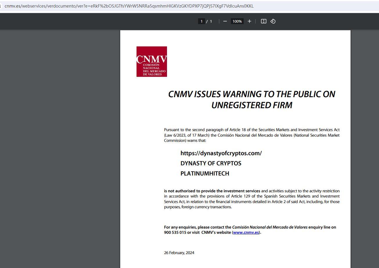 تصدر CNMV تحذيرًا للجمهور بشأن شركة غير مسجلة وفقًا للفقرة الثانية من المادة 18 من قانون أسواق الأوراق المالية وخدمات الاستثمار (القانون رقم 6/2023، الصادر في 17 مارس) وتحذر اللجنة الوطنية لسوق الأوراق المالية (اللجنة الوطنية لسوق الأوراق المالية) من ذلك : https://dynastyofcryptos.com/ Dynasty of Cryptos Platinumhitech غير مصرح لها بتقديم الخدمات والأنشطة الاستثمارية الخاضعة لقيود النشاط وفقًا لأحكام المادة 129 من قانون أسواق الأوراق المالية وخدمات الاستثمار الإسباني، فيما يتعلق بالأدوات المالية المفصلة في المادة 2 من القانون المذكور، بما في ذلك، لهذه الأغراض، المعاملات بالعملة الأجنبية. لأية استفسارات، يرجى الاتصال بخط الاستفسار الخاص باللجنة الوطنية لسوق القيم على الرقم 015 535 900 أو زيارة موقع CNMV (www.cnmv.es). 26 فبراير 2024