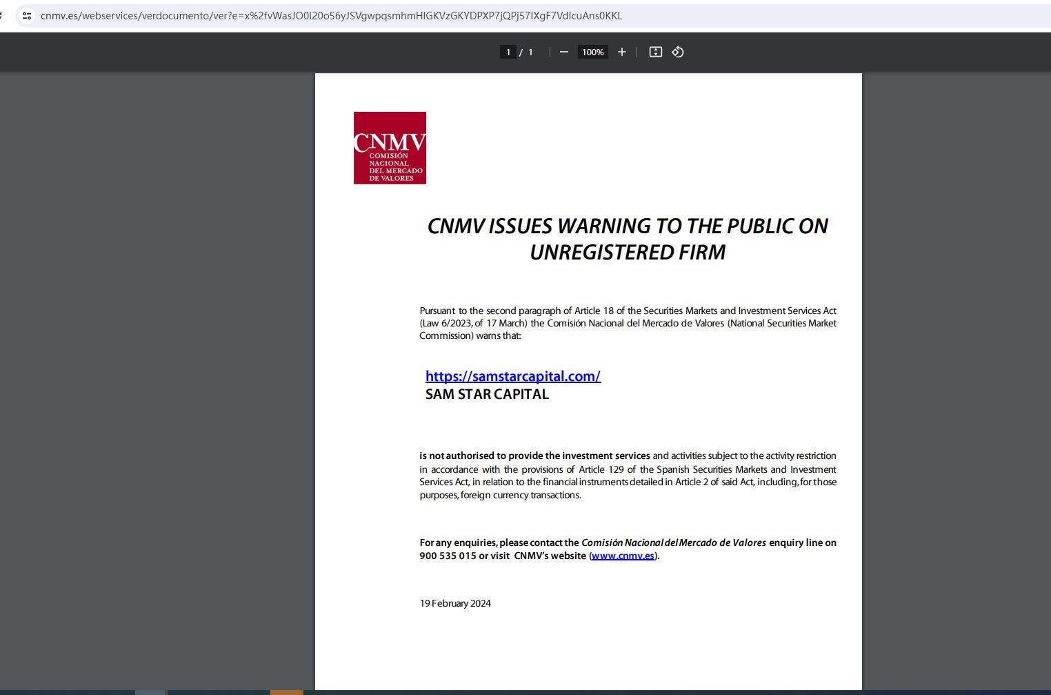 CNMV تصدر تحذيرًا للجمهور بشأن الشركة غير المسجلة بموجب الفقرة الثانية من المادة 18 من قانون أسواق الأوراق المالية وخدمات الاستثمار (القانون رقم 6/2023، الصادر في 17 مارس)، تحذر اللجنة الوطنية لسوق الأوراق المالية (اللجنة الوطنية لسوق الأوراق المالية) من ذلك : https://samstarcapital.com/ SAM STAR CAPITAL غير مصرح لها بتقديم الخدمات والأنشطة الاستثمارية الخاضعة لقيود النشاط وفقًا لأحكام المادة 129 من قانون أسواق الأوراق المالية وخدمات الاستثمار الإسباني، فيما يتعلق بالقطاع المالي. الأدوات المفصلة في المادة 2 من القانون المذكور، بما في ذلك، لهذه الأغراض، المعاملات بالعملة الأجنبية. لأية استفسارات، يرجى الاتصال بخط الاستفسار Comisión Nacional del Mercado de Valores على الرقم 900535015 أو زيارة موقع CNMV (www.cnmv.es). 19 فبراير 2024 .