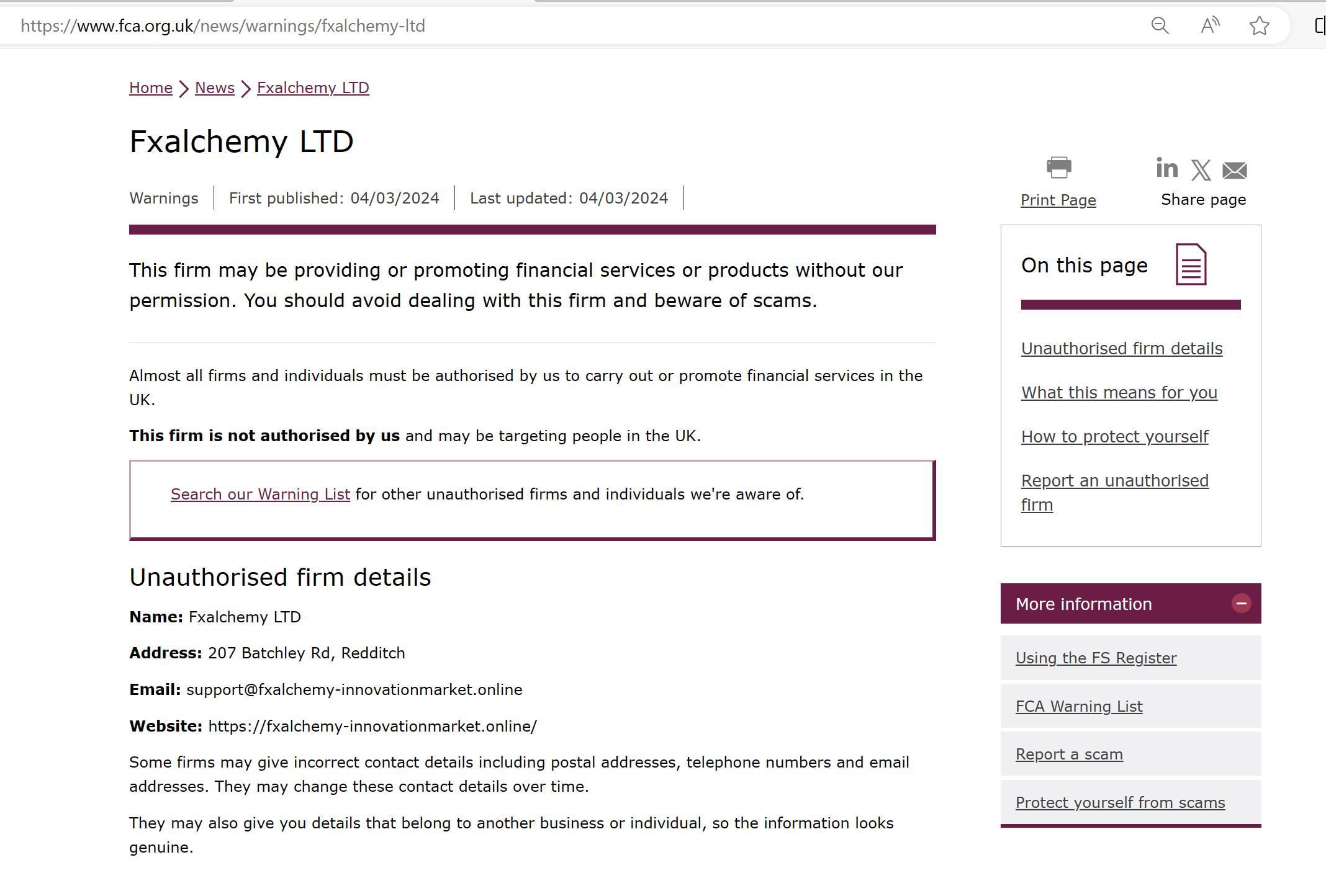 قائمة تحذير FCA للشركات غير المرخصة Fxalchemy LTD.