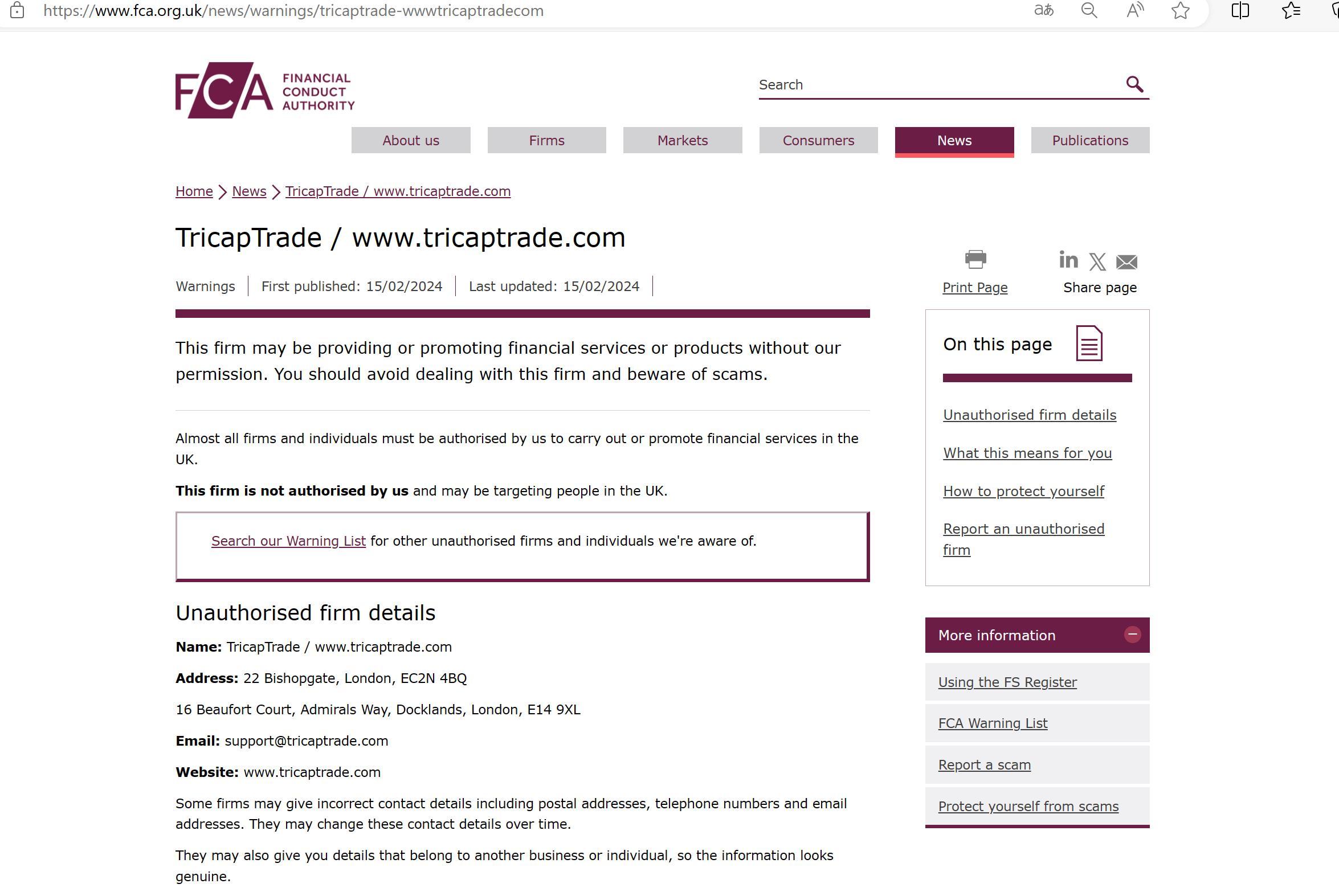 تم النشر لأول مرة: 15/02/2024 آخر تحديث: 15/02/2024 ربما تقدم هذه الشركة خدمات أو منتجات مالية أو تروج لها دون إذن منا. يجب عليك تجنب التعامل مع هذه الشركة والحذر من عمليات الاحتيال. يجب أن يتم ترخيص جميع الشركات والأفراد تقريبًا من قبلنا لتنفيذ الخدمات المالية أو الترويج لها في المملكة المتحدة. هذه الشركة غير مرخصة من جانبنا وربما تستهدف أشخاصًا في المملكة المتحدة. ابحث في قائمة التحذيرات الخاصة بنا عن الشركات والأفراد الآخرين غير المصرح لهم الذين نعرفهم. اسم تفاصيل الشركة غير المصرح بها: TricapTrade / شبكة الاتصالات العالمية. TricapTrade عنوان .com: 22 bishopgate, london, ec2n 4bq 16 beaufort Court, Admirals Way, Docklands, london, e14 9xl البريد الإلكتروني: support@ TricapTrade موقع .com: www. TricapTrade .com قد تقدم بعض الشركات تفاصيل اتصال غير صحيحة بما في ذلك العناوين البريدية وأرقام الهواتف وعناوين البريد الإلكتروني. وقد يقومون بتغيير تفاصيل الاتصال هذه بمرور الوقت. وقد يزودونك أيضًا بتفاصيل تخص شركة أخرى أو فردًا آخر، بحيث تبدو المعلومات حقيقية.
