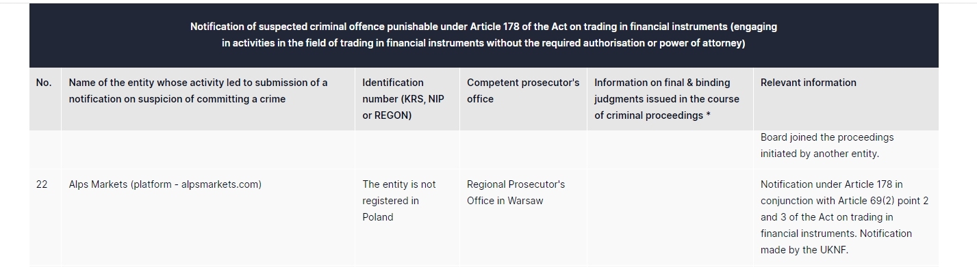 Alps Markets(منصة - alpsmarkets.com) الكيان غير مسجل في مكتب المدعي العام الإقليمي في بولندا في إخطار وارسو بموجب المادة 178 بالتزامن مع المادة 69 (2) النقطة 2 و 3 من قانون التداول في الأدوات المالية. الإخطار الذي أدلى به uknf.