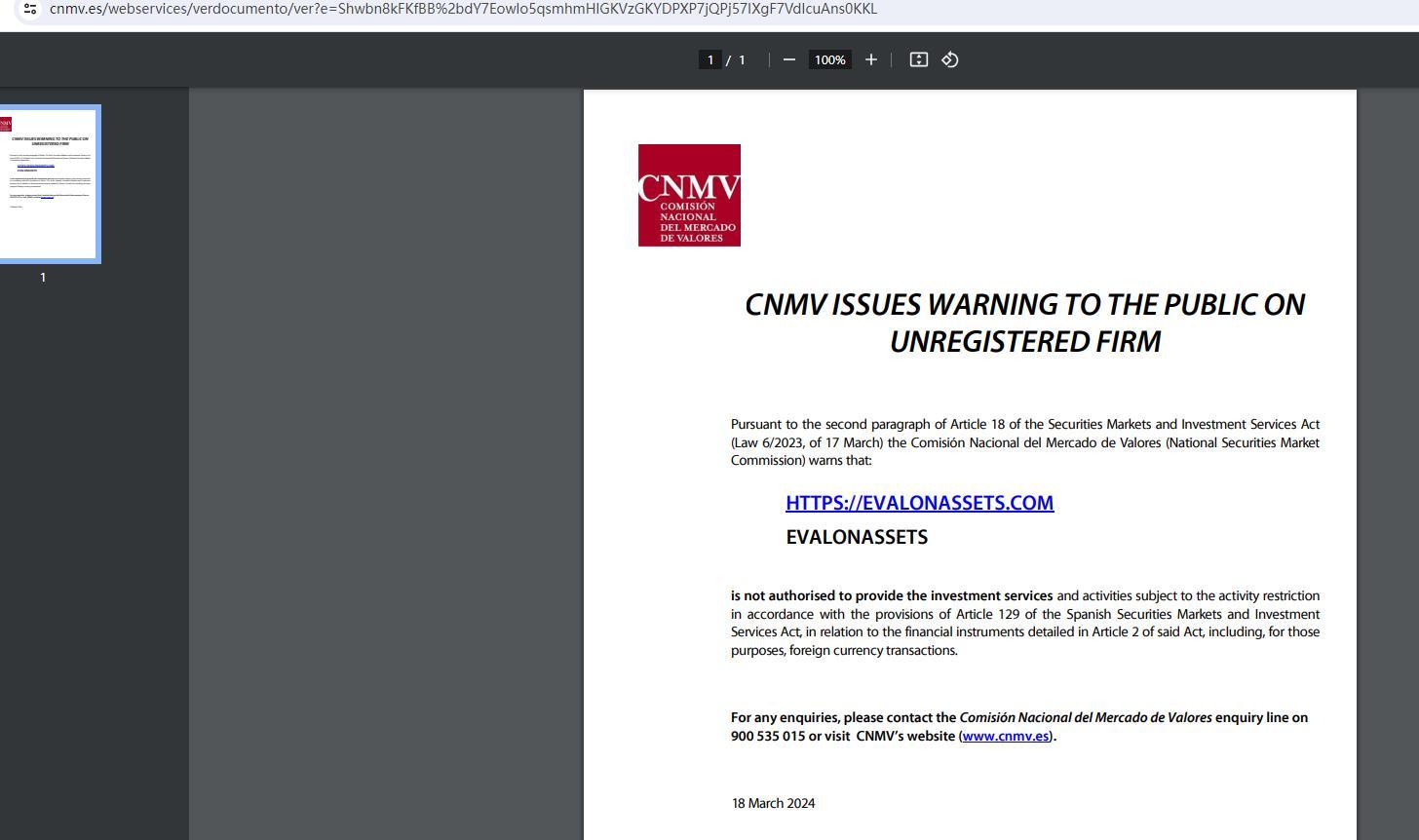 تصدر CNMV تحذيرًا للجمهور بشأن شركة غير مسجلة وفقًا للفقرة الثانية من المادة 18 من قانون أسواق الأوراق المالية وخدمات الاستثمار (القانون رقم 6/2023، الصادر في 17 مارس) وتحذر اللجنة الوطنية لسوق الأوراق المالية (اللجنة الوطنية لسوق الأوراق المالية) من ذلك : https:// evalonassets .com evalonassets غير مصرح له بتقديم الخدمات والأنشطة الاستثمارية الخاضعة لقيود النشاط وفقًا لأحكام المادة 129 من قانون أسواق الأوراق المالية وخدمات الاستثمار الإسباني، فيما يتعلق بالأدوات المالية المفصلة في المادة 2 من القانون المذكور، بما في ذلك، لتلك الأغراض، المعاملات بالعملة الأجنبية. لأية استفسارات، يرجى الاتصال بخط الاستفسار الخاص باللجنة الوطنية لسوق القيم على الرقم 015 535 900 أو زيارة موقع CNMV (www.cnmv.es). 18 مارس 2024