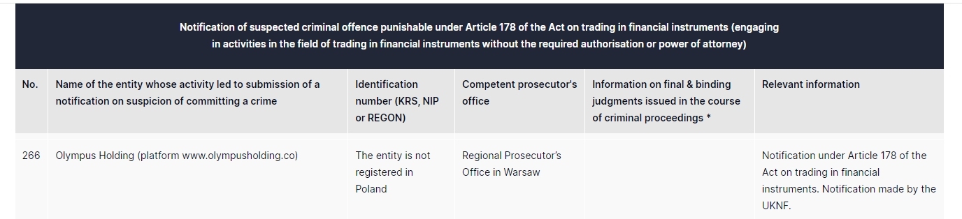 أوليمبوس القابضة (منصة www. Olympusholding .co) الكيان غير مسجل في مكتب المدعي العام الإقليمي في بولندا في إشعار وارسو بموجب المادة 178 من قانون التداول في الأدوات المالية. الإخطار الذي أدلى به uknf.