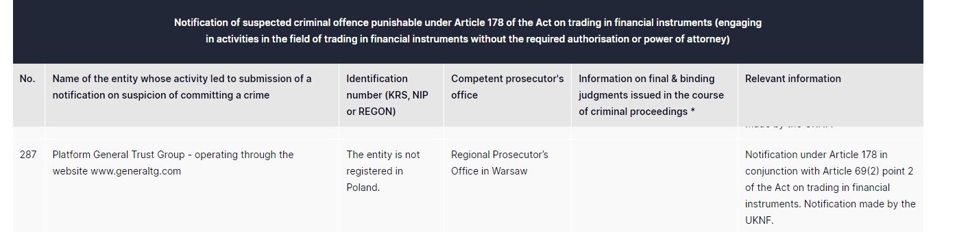منصة General Trust Group - العمل من خلال الموقع الإلكتروني www.generaltg.com الكيان غير مسجل في بولندا. إخطار مكتب المدعي العام الإقليمي في وارسو بموجب المادة 178 بالتزامن مع المادة 69 (2) النقطة 2 من قانون التداول في الأدوات المالية. الإخطار الذي أدلى به uknf.