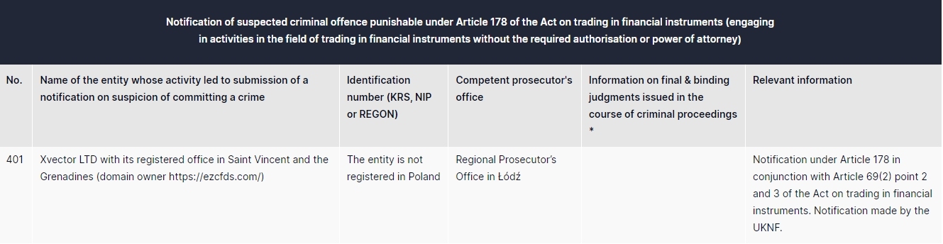 شركة xvector المحدودة التي يقع مكتبها المسجل في سانت فنسنت وجزر غرينادين (مالك النطاق https:// EZCFDs .com/) الكيان غير مسجل في مكتب المدعي العام الإقليمي في بولندا في لودز إشعار بموجب المادة 178 بالتزامن مع المادة 69 (2) النقطة 2 و 3 من قانون تداول الأدوات المالية. الإخطار الصادر عن uknf.