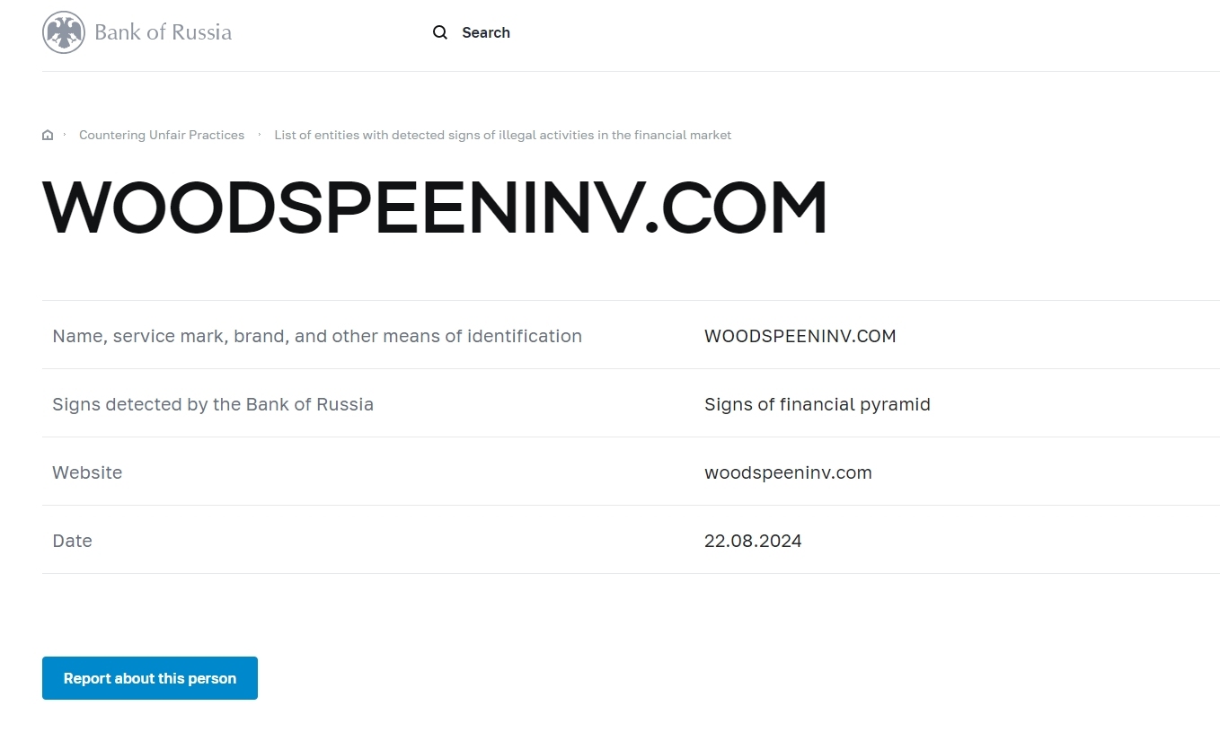الاسم وعلامة الخدمة والعلامة التجارية ووسائل التعريف الأخرى WOODSPEENINV.COM العلامات التي اكتشفها بنك روسيا علامات الهرم المالي الموقع الإلكتروني woodspeeninv.com التاريخ 22.08.2024.