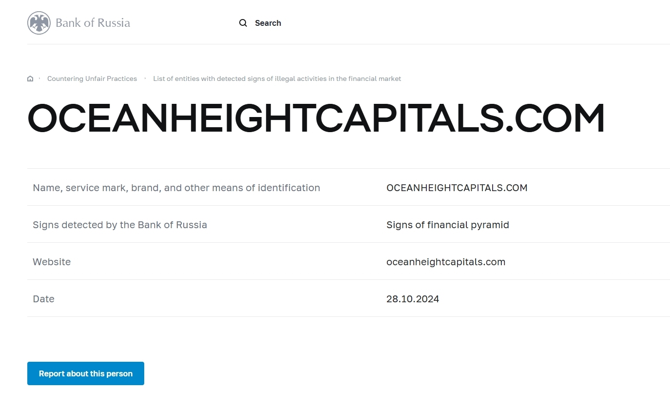 الاسم وعلامة الخدمة والعلامة التجارية ووسائل التعريف الأخرى OCEANHEIGHTCAPITALS.COM العلامات التي اكتشفها بنك روسيا علامات الهرم المالي الموقع الإلكتروني oceanheightcapitals.com التاريخ 28.10.2024