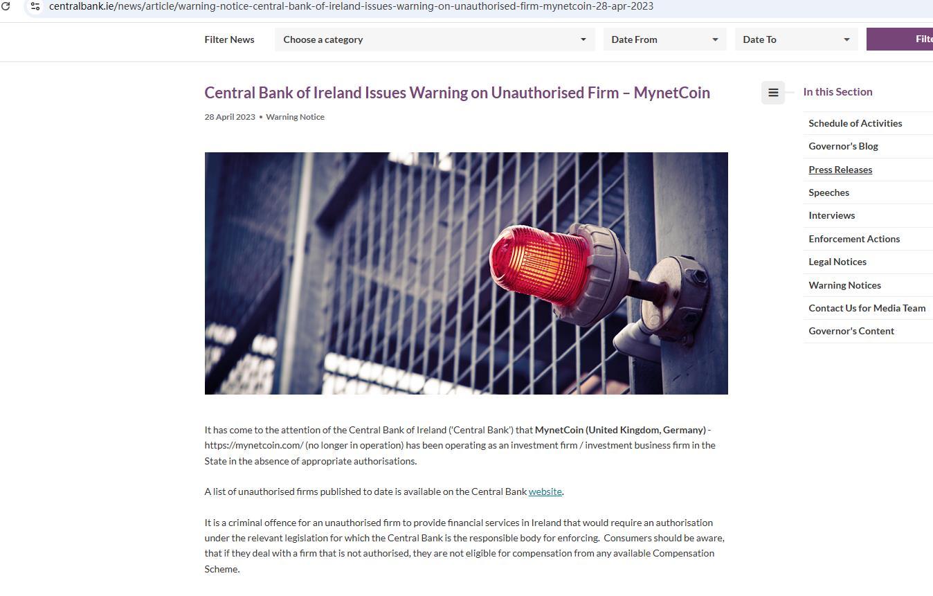 البنك المركزي الأيرلندي يصدر تحذيرا بشأن شركة غير مرخصة – MynetCoin