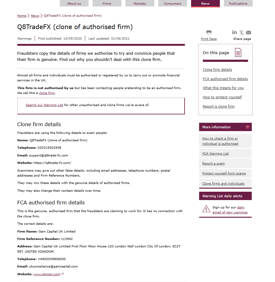 قائمة تحذير FCA للشركات غير المصرح لها Q8TradeFX (نسخة من شركة مصرح لها).