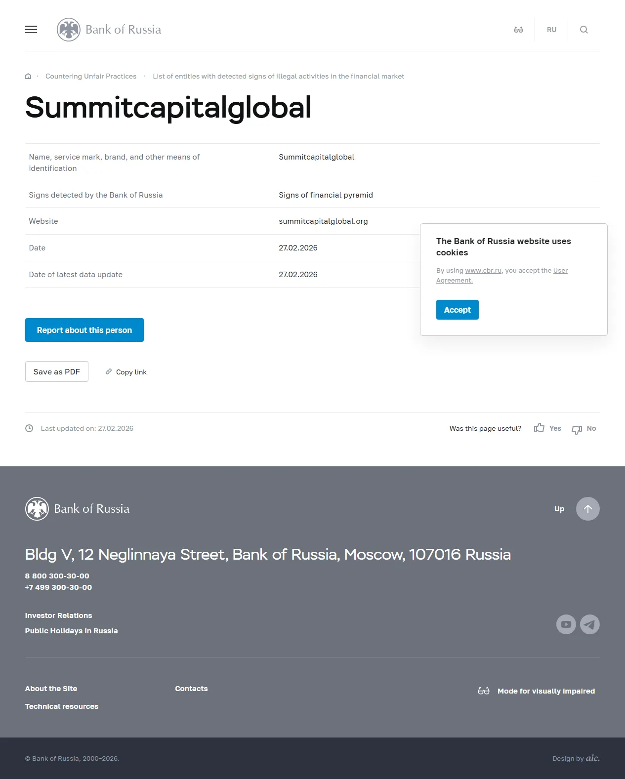 الاسم، علامة الخدمة، العلامة التجارية، ووسائل التعريف الأخرى Summitcapitalglobal العلامات التي اكتشفها البنك المركزي الروسي علامات الهرم المالي الموقع الإلكتروني summitcapitalglobal.org التاريخ 27.02.2026 تاريخ آخر تحديث للبيانات 27.02.2026.