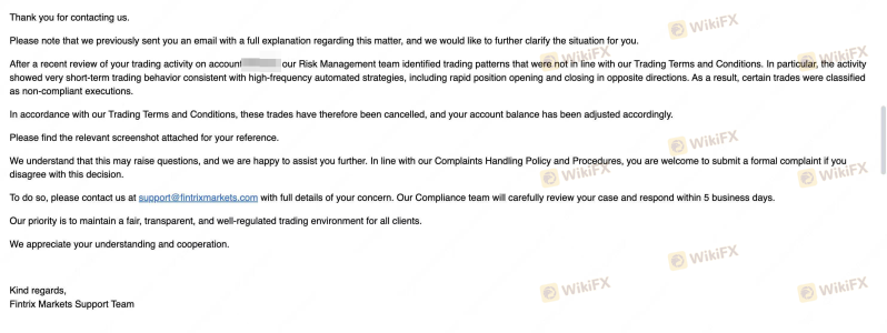 大家千万避雷 Fintrix Markets(母公司 Aksys Global Markets Ltd),这是一个典型的输打赢要的诈骗对赌盘! 我在该平台参与了他们授权的 跟单交易(Copy Trading) 。我本人并没有进行任何实际的手动或程序化操作,完全是跟随带单员的信号。 运气好,跟单赚了 1078 美金的利润。当我要申请出金时,平台直接撕破脸!他们先是在后台发了一张日结单,通过一笔名为 “PnL Correction”(盈亏修正) 的操作,直接把我账户里的 1078 美金利润全部扣除(见图2红框)。 当我发邮件质问时,他们竟然回复了一封极其荒谬的邮件(见图1), 诬陷我使用了“高频自动策略(high-frequency automated strategies)”和“双向快速开平仓”! 这简直是滑天下之大稽!我是一个纯粹的跟单者,用的是你们平台允许的带单员! - 如果带单员爆仓亏了我的本金,你们会以“违规执行”退钱给我吗?绝对不会! - 现在带单员赚了钱,你们就说带单员违规,然后把我们这些无辜跟单散户的利润全部没收! 这说明 Fintrix Markets 根本没有任何真实市场抛单,完全是对赌盘。客户赚钱了,他们就急眼拔网线、找技术借口抢钱! 在线客服全程装死拖延,邮件回复各种敷衍。希望天眼官方介入,也提醒所有交易者:远离 Fintrix Markets,这是一家只能亏钱、不能赚钱的纯黑平台!不退回我的 1078 美金,我会一直维权到底!