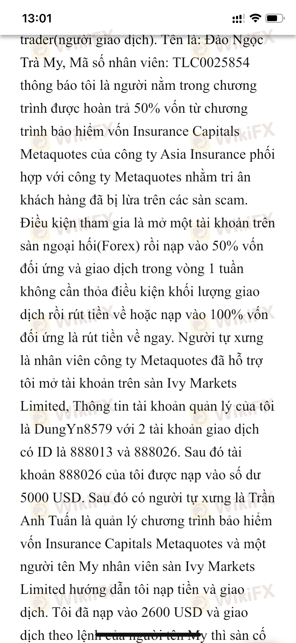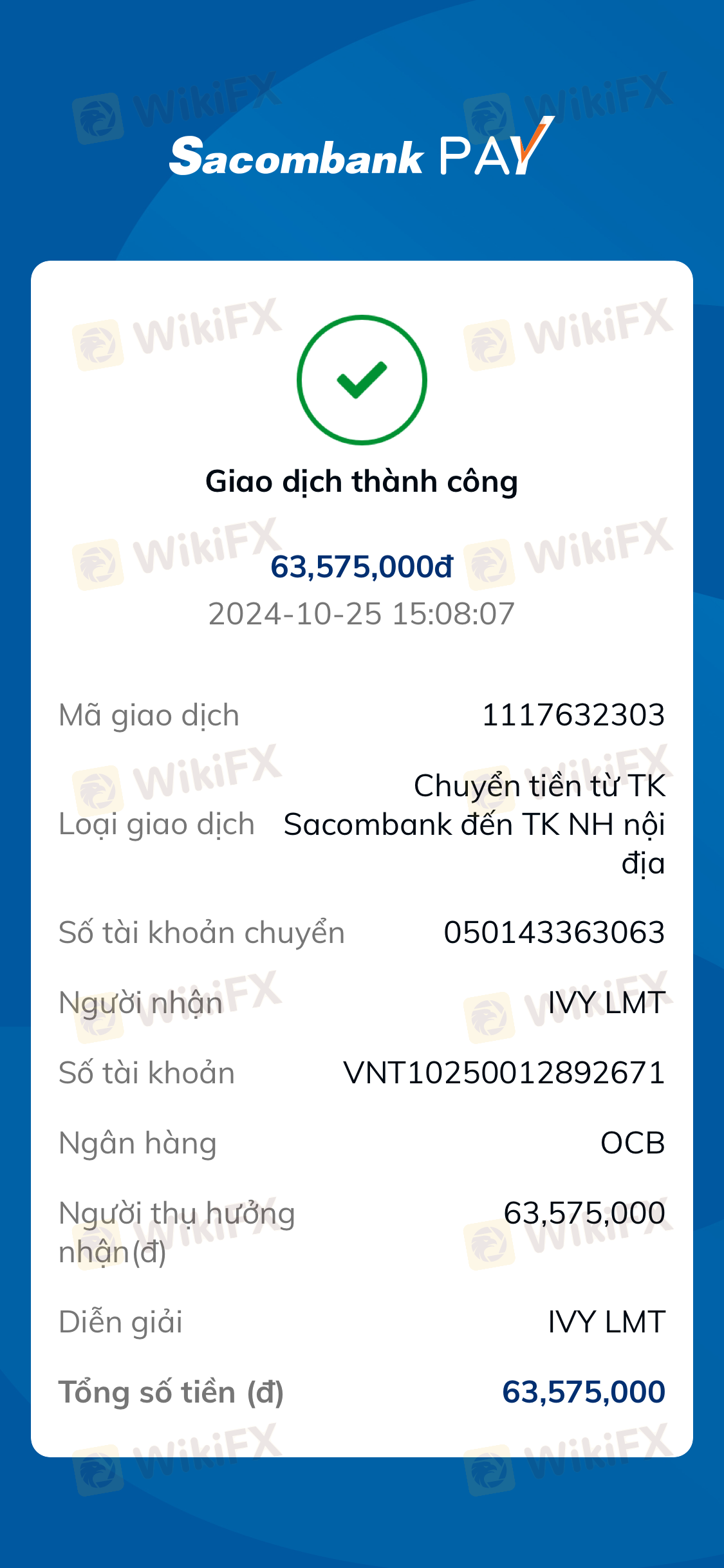في 25 نوفمبر 2024، قابلت وسيطًا يدعى Minh Quang (رقم هاتف Zalo: 0924.540.640) من IVy Markets. حثني هذا الشخص على إيداع مبلغ إجمالي قدره 12,000 دولار في المنصة تحت حساب MT5 رقم 891418 للتداول ونسخ التداول. عندما لاحظت علامات انخفاض وأنشطة احتيالية على المنصة، اقترحت سحبًا تجريبيًا بقيمة 84 دولار. وافقت المنصة على ذلك. ومع ذلك، عندما طلبت سحبًا كاملاً، لم تستجب المنصة. وخاصة في 27 ديسمبر 2024، نفذت المنصة بشكل منفرد أمر سحب من حسابي، بلغت قيمته 5,000 دولار من إجمالي 6,227 دولار. لقد طلبت من المنصة توضيح الوضع، ولكنني لم أتمكن من التواصل مع الوسيط أو دعم المنصة.