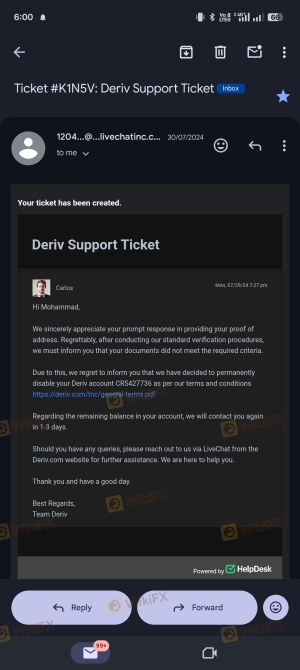 تم تعطيل حسابي التجاري فجأة بينما كانت لدي صفقات مفتوحة قيد التشغيل، واضطررت إلى مشاهدة أموالي تختفي دون حول ولا قوة. تم تعطيل وظائف التداول بالكامل – لم أتمكن من إغلاق أو إدارة صفقاتي. تم خصم مبلغ 1021 دولار من حسابي ببساطة كـ "رسوم"، دون أي إجراء من جانبي. تم حظر خيار الإيداع من نظير إلى نظير (P2P). حساب Deriv X لم يظهر حتى لتحويل الأموال. استمر نظامهم في عرض الأخطاء، بينما استمر في خصم الأموال من رصيدي. لقد تواصلت مع خدمة العملاء عدة مرات من خلال تسجيل الدخول إلى الموقع وواتساب، ولكن لم يتم حل أي شيء.