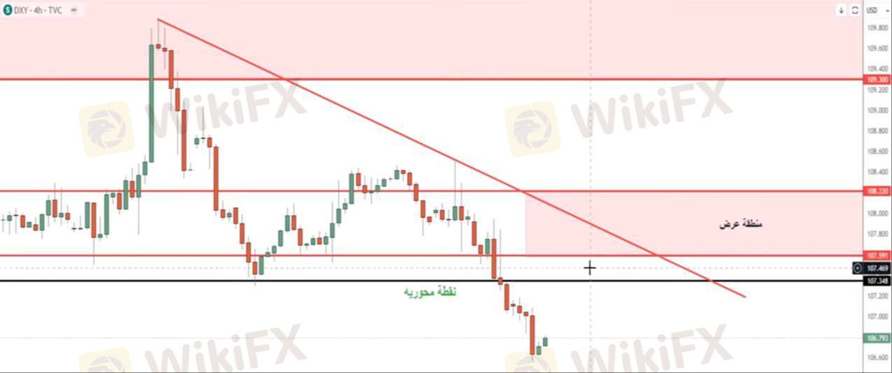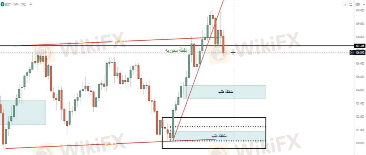 شهد مؤشر الدولار انخفاضًا خلال الأسبوع الماضي بسبب البيانات الاقتصادية السلبية وارتفاع التضخم، مما أدى إلى صعود الذهب. ويتوقع استمرار الهبوط بعد كسر النقطة المحورية عند 107.34، مع احتمالية التصحيح نحو 107.35 - 107.60 قبل استكمال الهبوط إلى 105.95 - 105.25، فيما يمثل اختراق 109.90 فشل هذه النظرة.