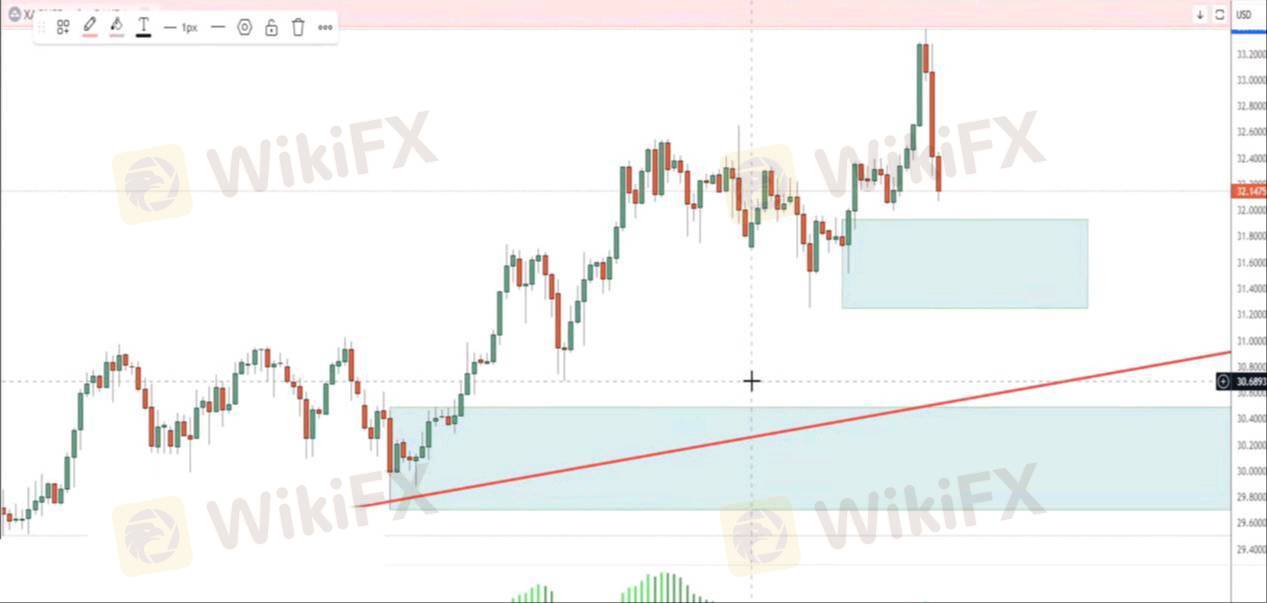 رغم الإغلاق الصاعد، حدث هبوط سريع من منطقة العرض. هناك منطقتان للطلب قد تدعمان الأسعار، مع أهمية مستوى 30.50 - 29.70 كمنطقة ارتكاز رئيسية للصعود. فشل المنطقة الأخيرة قد يعزز استمرار الهبوط، لكن الاتجاه العام لا يزال صاعدًا على الفريمات الأكبر.