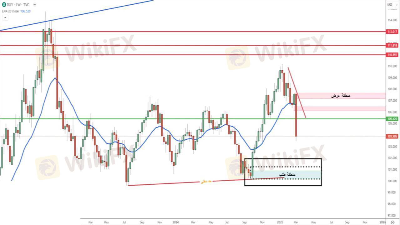 شهد مؤشر الدولار كما هو موضح بالصور إغلاقًا أسبوعيًا هبوطيًا بعد كسره لمستويات دعم هامة. ومع ذلك، فإن أي تصحيح صعودي قد يوفر فرص بيع عند مستويات 105.52. وإذا استمر الاتجاه الهابط، فقد نشهد عودة المؤشر إلى مستويات 102، بناءً على نتائج بيانات التضخم المقبلة.