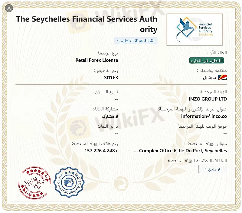 - عند تقييم شركة انزو INZO نجد انها مرخصة من هيئة تنظيم الخدمات المالية في سيشيل.