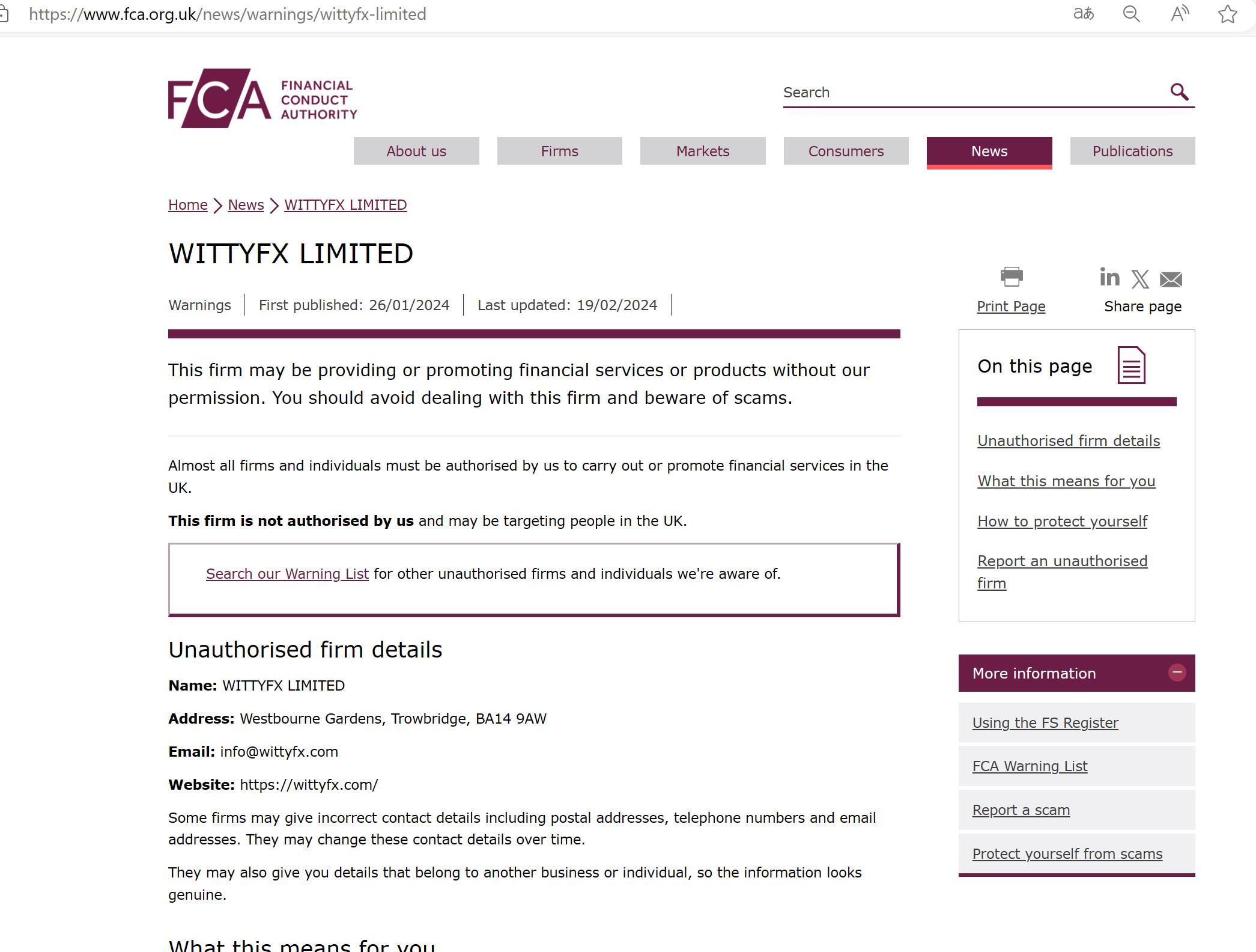 قائمة تحذير FCA للشركات غير المرخصة WITTYFX LIMITED.