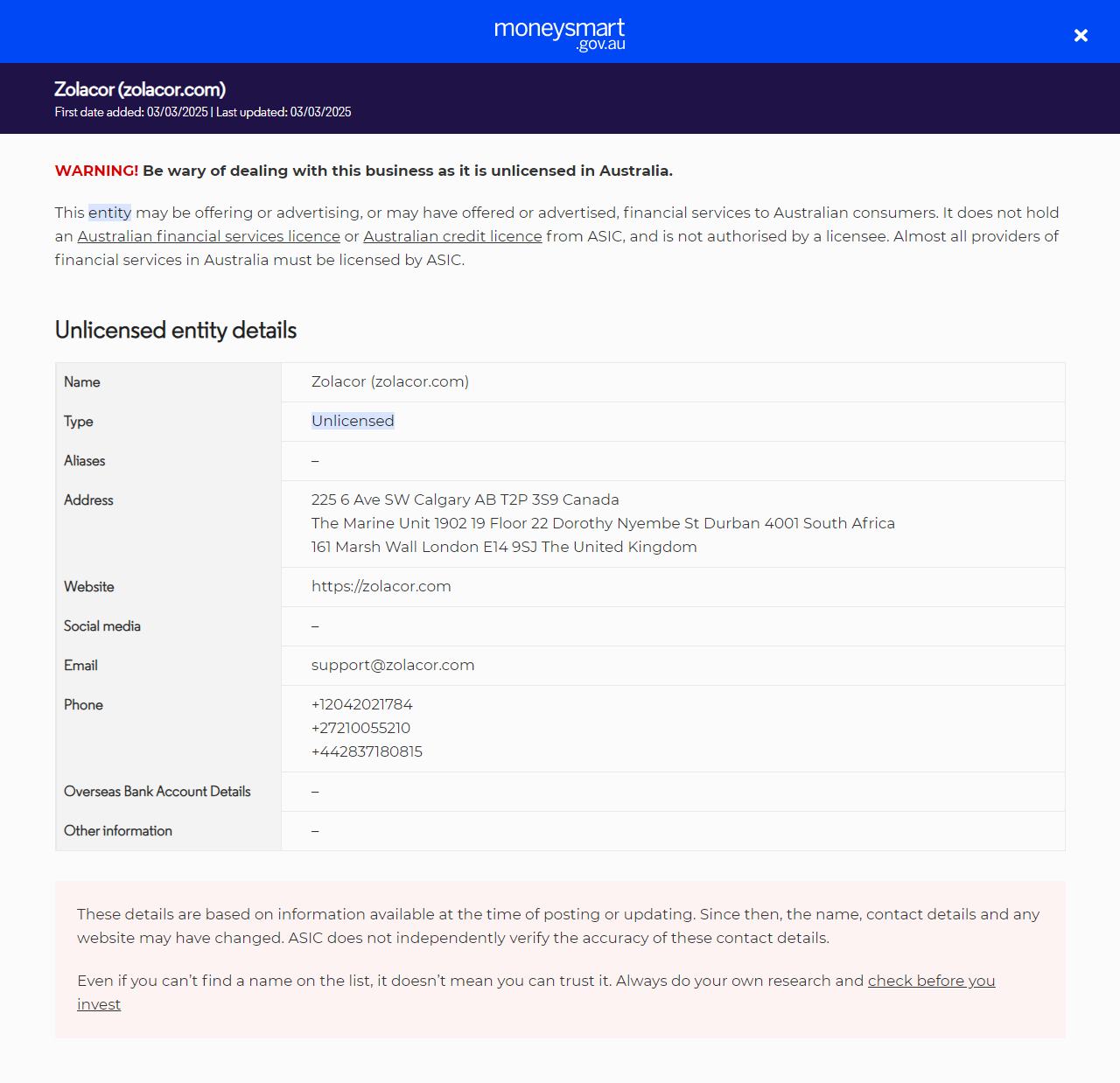 الاسم Zolacor (zolacor.com) النوعتقديم خدمات مالية (بما في ذلك المنتجات المالية) للأشخاص في أستراليا بدون ترخيص. لا يحملون ترخيص خدمات مالية أسترالية (AFS) أو ترخيص ائتمان أسترالي من ASIC. الأسماء المستعارة– العنوان225 الجادة السادسة الجنوبية الغربية كالغاري ألبرتا T2P 3S9 كنداالوحدة البحرية 1902 الطابق 19 22 شارع دوروثي نيمبي ديربان 4001 جنوب أفريقيا161 مارش وول لندن E14 9SJ المملكة المتحدة الموقع الإلكتروني https://zolacor.com وسائل التواصل الاجتماعي– البريد الإلكترونيدعم@zolacor.com الهاتف+12042021784+27210055210+442837180815 تفاصيل الحساب البنكي الأجنبي– معلومات أخرى–.