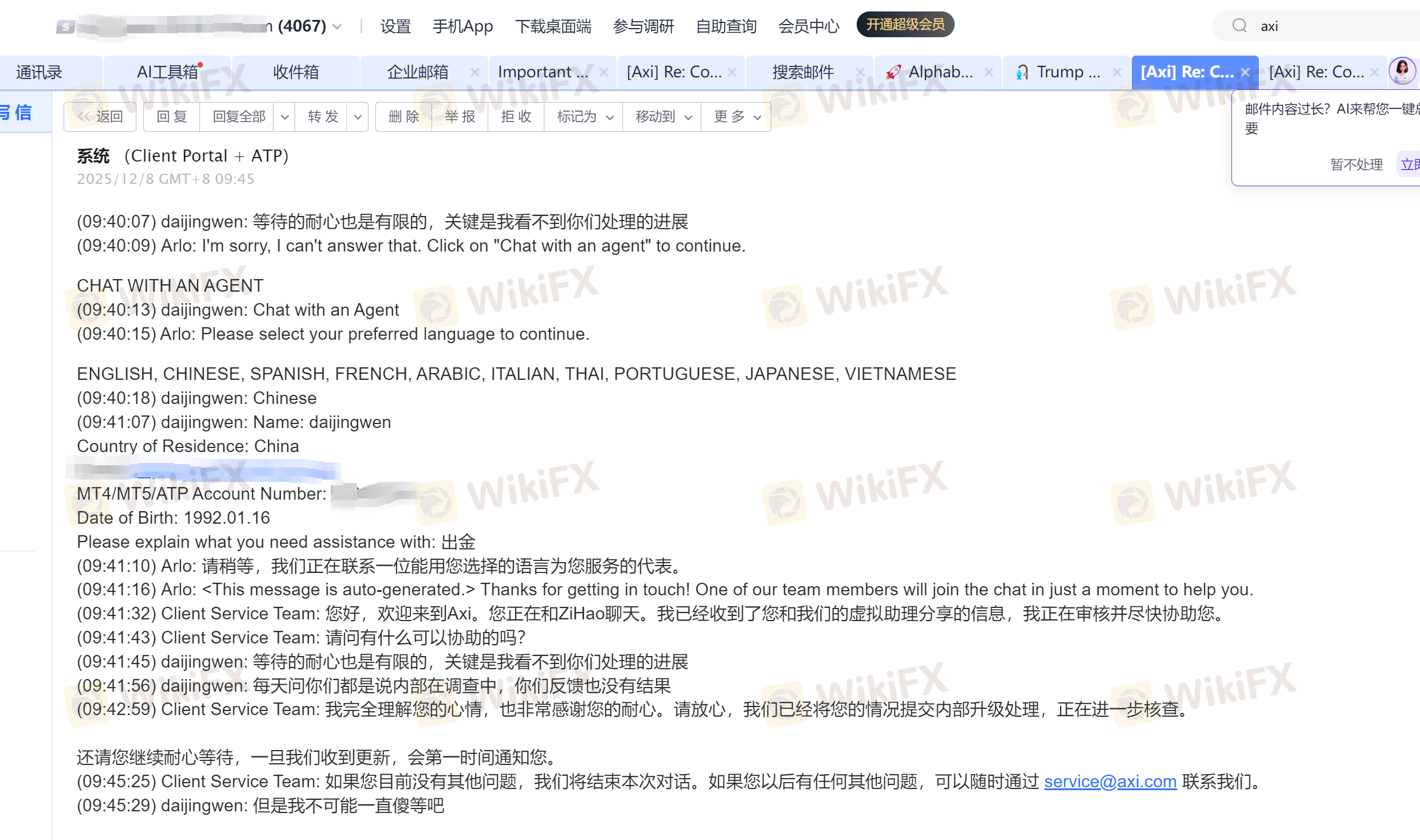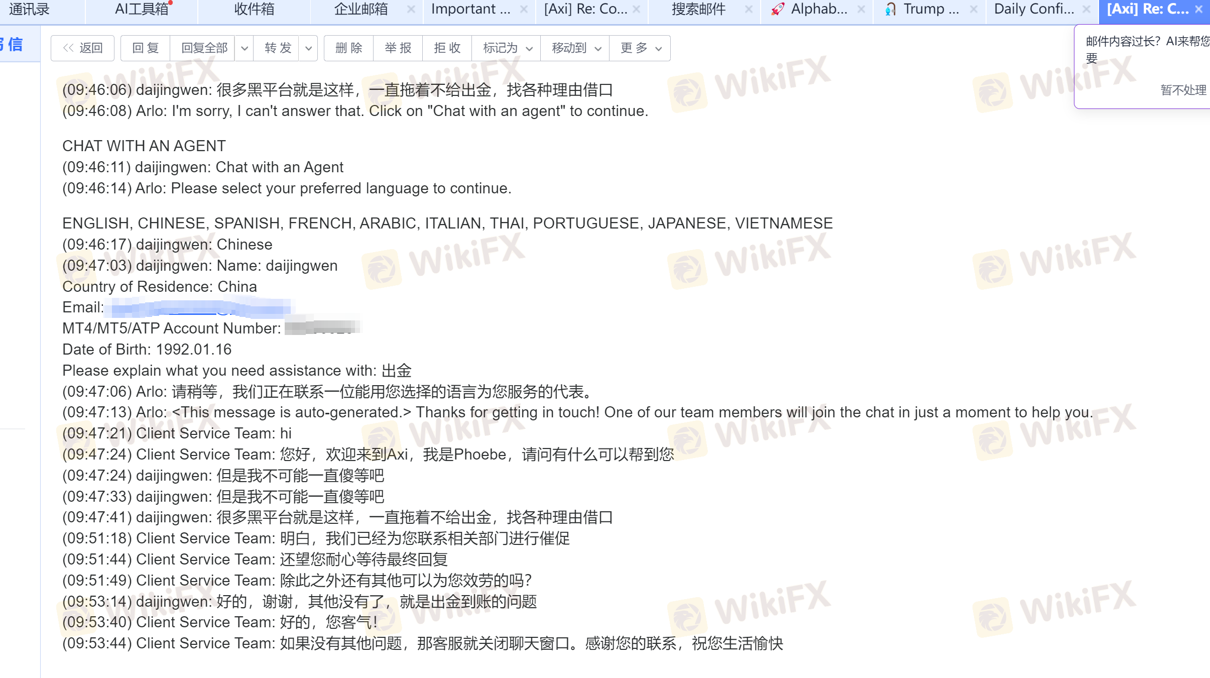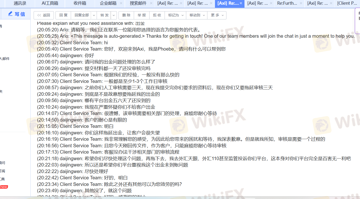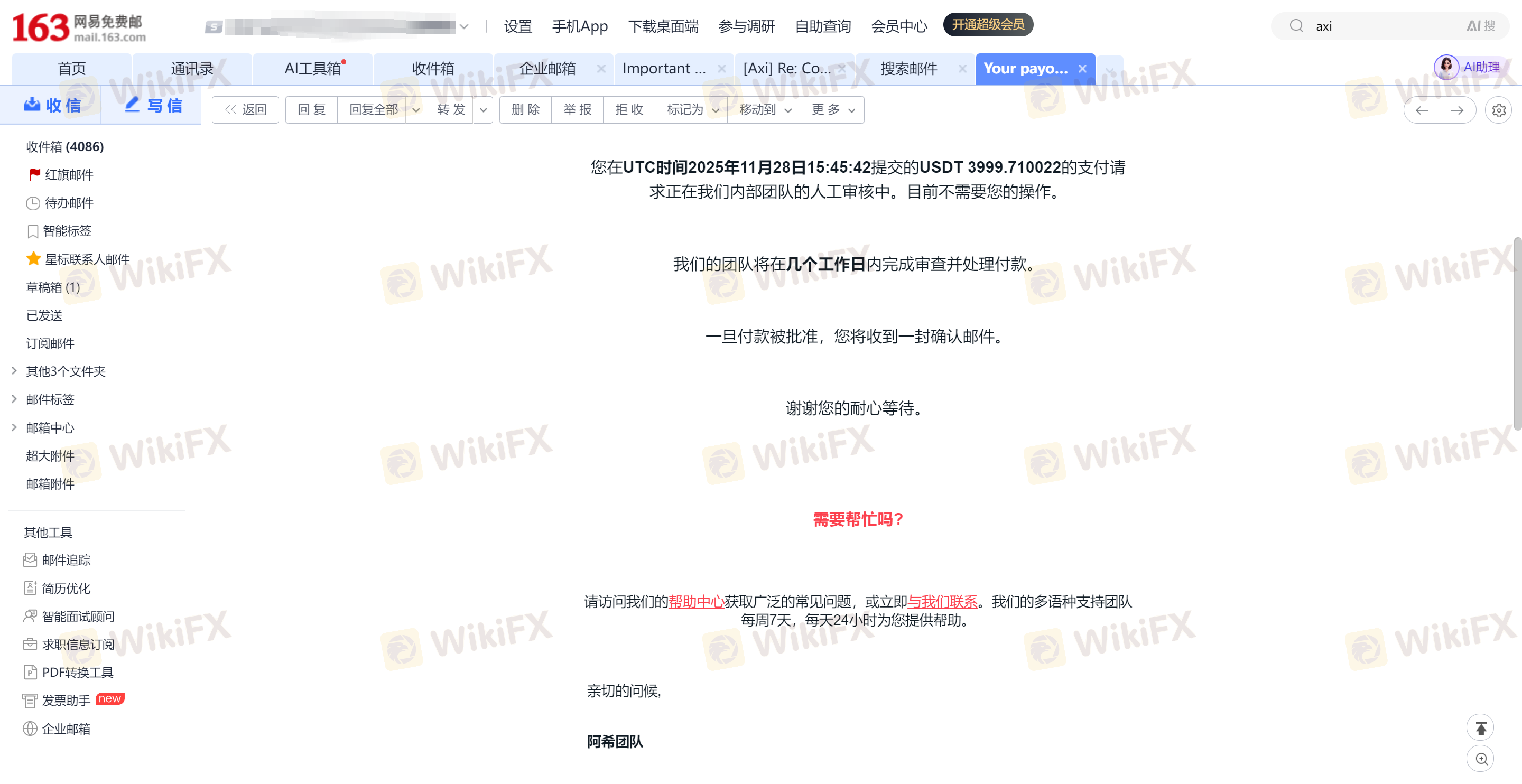 Am 7. Mai 2025 stellte ich fest, dass am 24. April 2025 ohne meine Zustimmung 920 USD von meinem AXI MT4-Konto abgehoben und auf eine Bank in den VAE überwiesen wurden, wobei nur noch 7.51 USD verblieben. AXI bestätigte die betrügerische Transaktion, gab mir jedoch nur eine Referenznummer und forderte mich auf, die Bank zu kontaktieren. Meine KYC-Dokumente wurden aus ihrem Portal gelöscht, und es gab keinen Nachweis über das betrügerische Konto. AXI behauptete, die Transaktion stamme von einer IP aus Bosnien-Herzegowina, gab mir jedoch die Schuld und vermutete die Nutzung eines VPN oder geteilter Zugangsdaten. Dies ist inakzeptabel, da sie die Abhebung nicht verifizierten oder mein Konto schützten. Nach 16 Tagen verwies ihre Antwort auf die Geschäftsbedingungen und lehnte jede Verantwortung ab. Ich habe dies der ASIC, der FCA und der Financial Commission gemeldet. AXI's Fahrlässigkeit verursachte mir finanzielle Verluste und emotionalen Stress. Ich habe Beweise und rate Händlern, im Umgang mit AXI vorsichtig zu sein. J.A.V.R. Bucaramanga (Kolumbien) 1. August 2025