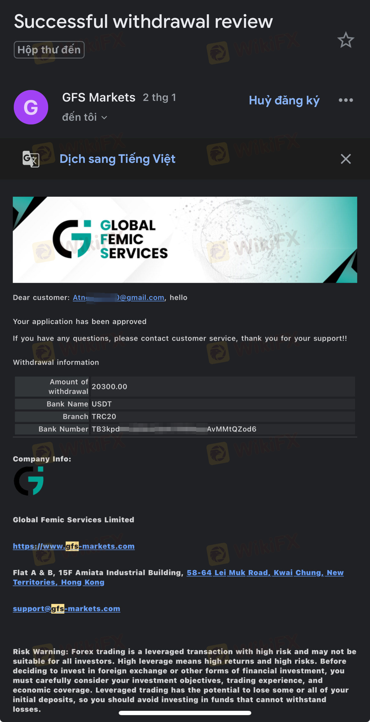 Ich habe eine erfolgreiche Abhebungsbenachrichtigung vom GFS-Support-Team erhalten, aber die USDT wurden noch nicht auf meine Wallet-Adresse überwiesen. Ich erhielt eine Benachrichtigung, dass die Abhebung nach dem Lunar New Year-Feiertag bearbeitet würde, aber sie wurde immer noch nicht durchgeführt. Ich habe mehrere E-Mails gesendet, aber keine Antwort erhalten. Derzeit kann ich mich nicht auf der Website des Unternehmens anmelden. Dies ist die Benachrichtigung, dass die Abhebung am 2. Januar 2025 auf meine Wallet abgeschlossen wurde. Seit diesem Datum habe ich die USDT jedoch immer noch nicht erhalten.