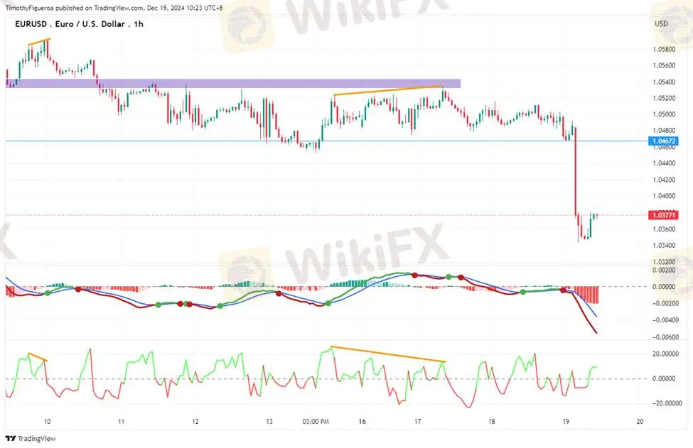 EURUSD - The euro weakened after breaking below 1.04672, following market expectations. However, the extent of the decline surprised analysts who had anticipated a weaker dollar in the short term. The Feds hawkish tone for the coming year shifted sentiment sharply, leading to a surge in dollar strength.