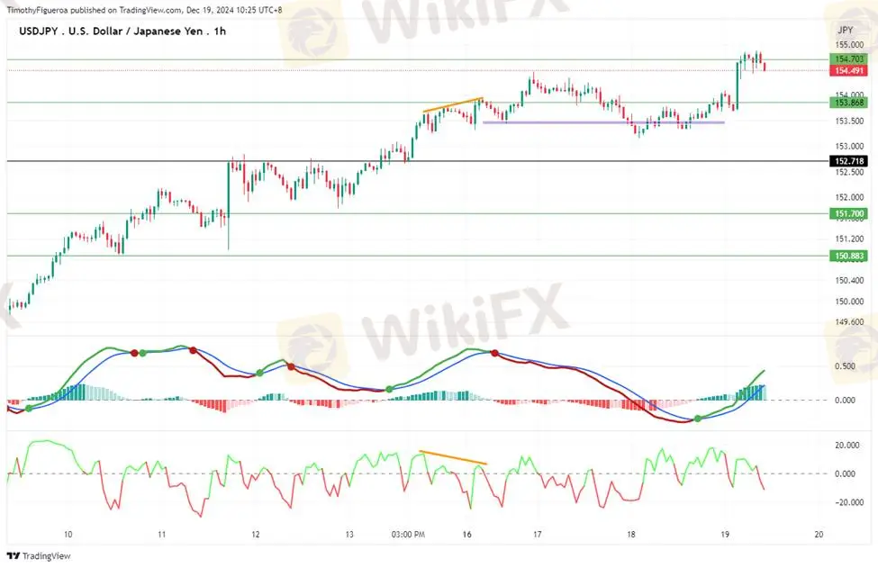 USDJPY - The yen gained strength and bullish momentum but struggled to move decisively past the 154.703 resistance level. Despite the Feds rate decision, price movement remained subdued.