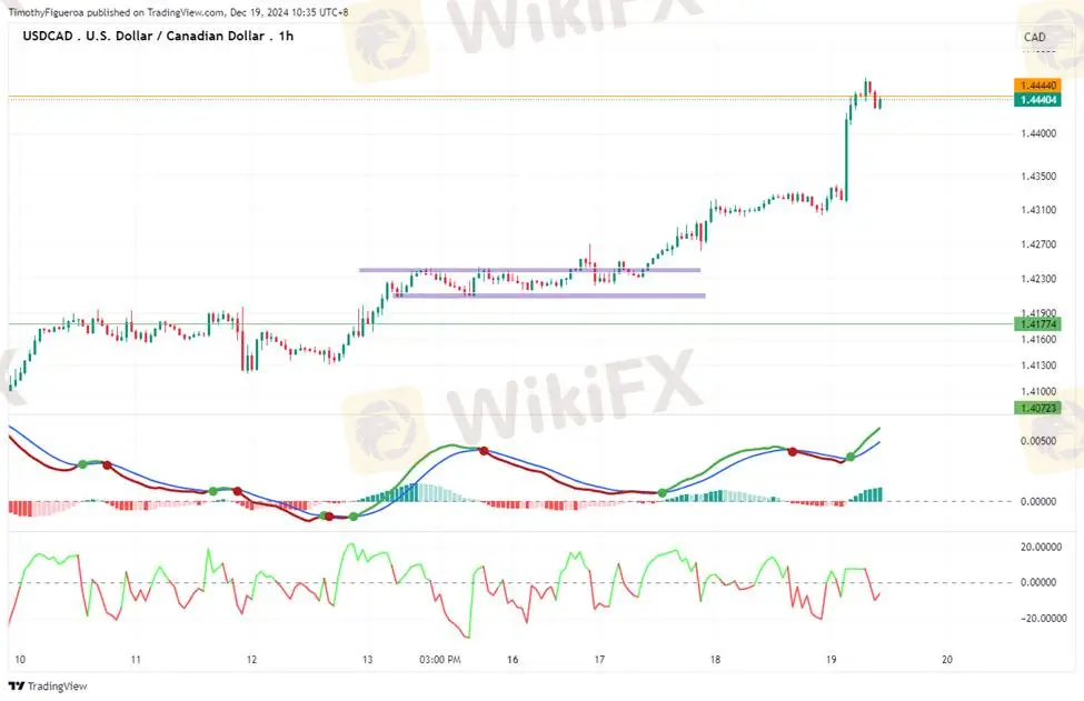 USDCAD - The CAD reached 1.44440 as predicted, with the MACD reflecting strong buying momentum. The RSI also signals bullish strength, despite low levels that follow a significant price move. Market reactions have been slightly delayed, but further buying is anticipated.