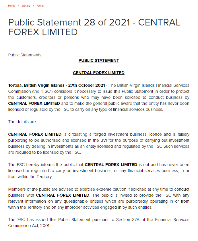 Öffentliche Erklärung 28 von 2021 – CENTRAL FOREX LIMITED Öffentliche Erklärungen ÖFFENTLICHE ERKLÄRUNG CENTRAL FOREX LIMITED Tortola, Britische Jungferninseln – 27. Oktober 2021 – Die British Virgin Islands Financial Services Commission (der „FSC“) hält es für notwendig, diese öffentliche Erklärung abzugeben, um dies zu tun die Kunden, Gläubiger oder Personen zu schützen, die von CENTRAL FOREX LIMITED möglicherweise aufgefordert wurden, Geschäfte zu tätigen, und die Öffentlichkeit darauf aufmerksam zu machen, dass das Unternehmen niemals vom FSC lizenziert oder reguliert wurde, um Finanzdienstleistungsgeschäfte jeglicher Art zu betreiben. Die Einzelheiten sind: CENTRAL FOREX LIMITED bringt eine gefälschte Investmentgeschäftslizenz in Umlauf und gibt fälschlicherweise vor, in den BVI zum Zwecke der Durchführung von Investmentgeschäften autorisiert und lizenziert zu sein, indem sie als eine von der FSC lizenzierte und regulierte Einheit mit Investitionen handelt. Solche Dienstleistungen sind vom FSC lizensiert werden. Der FSC informiert hiermit die Öffentlichkeit, dass CENTRAL FOREX LIMITED nicht lizenziert oder reguliert wurde, um Investmentgeschäfte oder Finanzdienstleistungsgeschäfte in oder aus dem Gebiet zu betreiben. Mitgliedern der Öffentlichkeit wird geraten, äußerste Vorsicht walten zu lassen, wenn sie zu irgendeinem Zeitpunkt aufgefordert werden, Geschäfte mit CENTRAL FOREX LIMITED zu tätigen. Die Öffentlichkeit wird aufgefordert, dem FSC alle relevanten Informationen über alle fragwürdigen Unternehmen, die angeblich in oder von innerhalb des Territoriums aus tätig sind, und über alle unzulässigen Aktivitäten, die von solchen Unternehmen begangen werden, zur Verfügung zu stellen. Der FSC hat diese öffentliche Erklärung gemäß Abschnitt 37A des Financial Services Commission Act von 2001 herausgegeben.