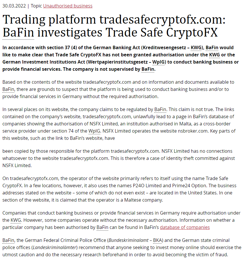 30.03.2022 | Thema unerlaubtes Geschäft Handelsplattform tradesafecryptofx.com: Bafin ermittelt Trade Safe CryptoFx gemäß § 37 abs. 4 kwg weist die bafin darauf hin Trade Safe CryptoFx ihm wurde keine erlaubnis nach dem kwg oder dem wertpapierinstitutsgesetz (wpig) zum betrieb von bankgeschäften oder zum erbringen von finanzdienstleistungen erteilt. das unternehmen wird nicht von der bafin beaufsichtigt. aufgrund der inhalte der webseite tradesafecryptofx.com sowie der bafin vorliegenden informationen und unterlagen besteht der begründete verdacht, dass die plattform ohne die erforderliche erlaubnis zum abwickeln von bankgeschäften und/oder zum erbringen von finanzdienstleistungen in deutschland genutzt wird. An mehreren Stellen auf seiner Website gibt das Unternehmen an, von der Bafin reguliert zu werden. diese Behauptung ist nicht wahr. die auf der Website des Unternehmens, tradesafecryptofx.com, enthaltenen Links führen unzulässigerweise zu einer Seite in der Unternehmensdatenbank der bafin, aus der die Zulassung hervorgeht NSFX Limited , eine in malta zugelassene einrichtung, als grenzüberschreitender dienstleistungsanbieter gemäß abschnitt 74 des wpig. NSFX Limited betreibt die Website NSBroker .com. Wesentliche Teile dieser Website, wie beispielsweise der Link zur Website der bafin, wurden von den Verantwortlichen der Plattform tradesafecryptofx.com kopiert. NSFX Limited hat keinerlei Verbindungen zur Website tradesafecryptofx.com. es handelt sich also um einen begangenen Identitätsdiebstahl NSFX Limited . auf tradesafecryptofx.com bezieht sich der Betreiber der Website primär auf sich selbst mit dem Namen Trade Safe CryptoFx . an einigen Stellen werden jedoch auch die Namen p24o limited und prime24 option verwendet. Die auf der Website angegebenen Geschäftsadressen – von denen einige gar nicht existieren – befinden sich in den Vereinigten Staaten. In einem Abschnitt der Website wird behauptet, dass der Betreiber ein maltesisches Unternehmen ist. unternehmen, die in deutschland bankgeschäfte betreiben oder finanzdienstleistungen erbringen, benötigen eine erlaubnis nach dem kwg. Einige Unternehmen sind jedoch ohne die erforderliche Genehmigung tätig. ob ein bestimmtes unternehmen von der bafin zugelassen wurde, erfahren sie in der unternehmensdatenbank der bafin Die bafin, das Bundeskriminalamt (bka) und die Landeskriminalämter empfehlen allen, die Geld im Internet anlegen möchten sollten äußerste Vorsicht walten lassen und vorher die notwendigen Nachforschungen anstellen, um nicht Opfer eines Betrugs zu werden.