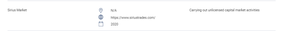 „Dieser Abschnitt enthält die Liste der nicht autorisierten Websites, Anlageprodukte, Unternehmen und Einzelpersonen. Diese Liste umfasst: Personen, die ohne eine Lizenz der SC die folgenden regulierten Aktivitäten ausüben oder sich als solche ausgeben: Handel mit Wertpapieren; Handel mit Derivaten; Fondsverwaltung; Beratung zu Unternehmensfinanzierung; Anlageberatung; Finanzplanung; und Handel mit privaten Altersvorsorgeplänen. Personen, die einen anerkannten Markt ohne Genehmigung betreiben. Personen, die ohne Genehmigung, Genehmigung oder Anerkennung Wertpapiere ausgeben oder anbieten. Personen, die das Logo von SC missbrauchen und die SC falsch darstellen. „Sirius Market N/A https://www.siriustrades.com/ 2020 Durchführung nicht lizenzierter Kapitalmarktaktivitäten