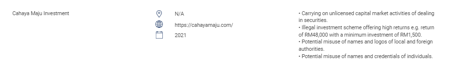 „Dieser Abschnitt enthält die Liste der nicht autorisierten Websites, Anlageprodukte, Unternehmen und Einzelpersonen. Diese Liste umfasst: Personen, die ohne eine Lizenz der SC die folgenden regulierten Tätigkeiten ausüben oder sich als solche ausgeben: Handel mit Wertpapieren; Handel mit Derivaten; Fondsverwaltung; Beratung zu Unternehmensfinanzierung; Anlageberatung; Finanzplanung; und Handel mit privaten Altersvorsorgeplänen. Personen, die einen anerkannten Markt ohne Genehmigung betreiben. Personen, die ohne Genehmigung, Genehmigung oder Anerkennung Wertpapiere ausgeben oder anbieten. Personen, die das Logo von SC missbrauchen und das Logo von SC falsch darstellen. " CAHAYA MAJU INVESTMENT n/a https://cahayamaju.com/ 2021 • Ausübung nicht lizenzierter Kapitalmarktaktivitäten im Zusammenhang mit dem Handel mit Wertpapieren. • Illegale Investitionspläne, die hohe Renditen bieten, z. B. eine Rendite von 48.000 RM bei einer Mindestinvestition von 1.500 RM. • Möglicher Missbrauch von Namen und Logos lokaler und ausländischer Behörden. • Möglicher Missbrauch von Namen und Anmeldeinformationen von Personen.