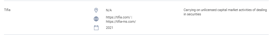 „Dieser Abschnitt enthält die Liste der nicht autorisierten Websites, Anlageprodukte, Unternehmen und Einzelpersonen. Diese Liste umfasst: Personen, die ohne eine Lizenz der SC die folgenden regulierten Tätigkeiten ausüben oder sich als solche ausgeben: Handel mit Wertpapieren; Handel mit Derivaten; Fondsverwaltung; Beratung zu Unternehmensfinanzierung; Anlageberatung; Finanzplanung; und Handel mit privaten Altersvorsorgeplänen. Personen, die einen anerkannten Markt ohne Genehmigung betreiben. Personen, die ohne Genehmigung, Genehmigung oder Anerkennung Wertpapiere ausgeben oder anbieten. Personen, die das Logo von SC missbrauchen und das Logo von SC falsch darstellen. " Tifia n/a https:// Tifia .com/ | https:// Tifia -ms.com/ 2021 Ausübung nicht lizenzierter Kapitalmarktaktivitäten im Zusammenhang mit dem Handel mit Wertpapieren