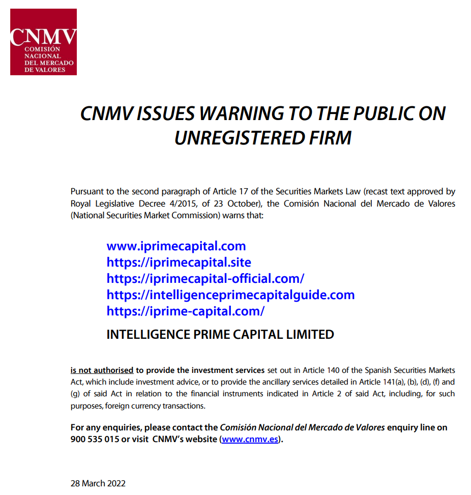 INTELLIGENCE PRIME CAPITAL LIMITED (http://www.iprimecapital.com/; https://iprimecapital-official.com/; https://iprimecapital.site/; https://intelligenceprimecapitalguide.com; https://iprime- Capital.com/)/; 30.03.2022 Spanien CNMV WARNUNG AN DIE ÖFFENTLICHKEIT ÜBER NICHT REGISTRIERTES UNTERNEHMEN Gemäß Artikel 17 Absatz 2 des Wertpapiermarktgesetzes (Neufassung genehmigt durch das Königliche Gesetzesdekret 4/2015 vom 23. Oktober) hat die Comisión Nacional del Mercado de Valores (Nationale Kommission für den Wertpapiermarkt) weist darauf hin, dass INTELLIGENCE PRIME CAPITAL LIMITED nicht berechtigt ist, die in Artikel 140 des spanischen Wertpapiermarktgesetzes genannten Anlagedienstleistungen zu erbringen, zu denen auch Anlageberatung gehört, oder die in Artikel 141 aufgeführten Nebendienstleistungen zu erbringen (a), (b), (d), (f) und (g) des genannten Gesetzes in Bezug auf die in Artikel 2 des genannten Gesetzes genannten Finanzinstrumente, einschließlich für diese Zwecke auch Fremdwährungstransaktionen. Bei Fragen wenden Sie sich bitte an die Comisión Nacional del Mercado de Valores unter der Rufnummer 900 535 015 oder besuchen Sie die Website von CNMV (www.cnmv.es). 28. März 2022.