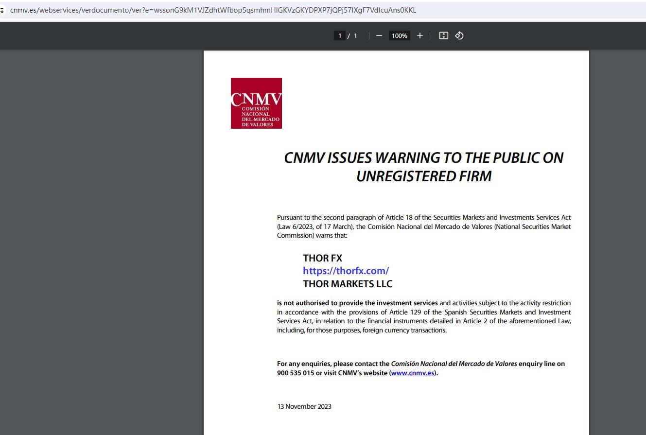 • Grund der Bestrafung Thor FX https:// ThorFX .com/ Thor Markets LLC ist nicht berechtigt, Wertpapierdienstleistungen und -tätigkeiten zu erbringen, die der Tätigkeitsbeschränkung gemäß den Bestimmungen von Artikel 129 des spanischen Gesetzes über Wertpapiermärkte und Wertpapierdienstleistungen unterliegen