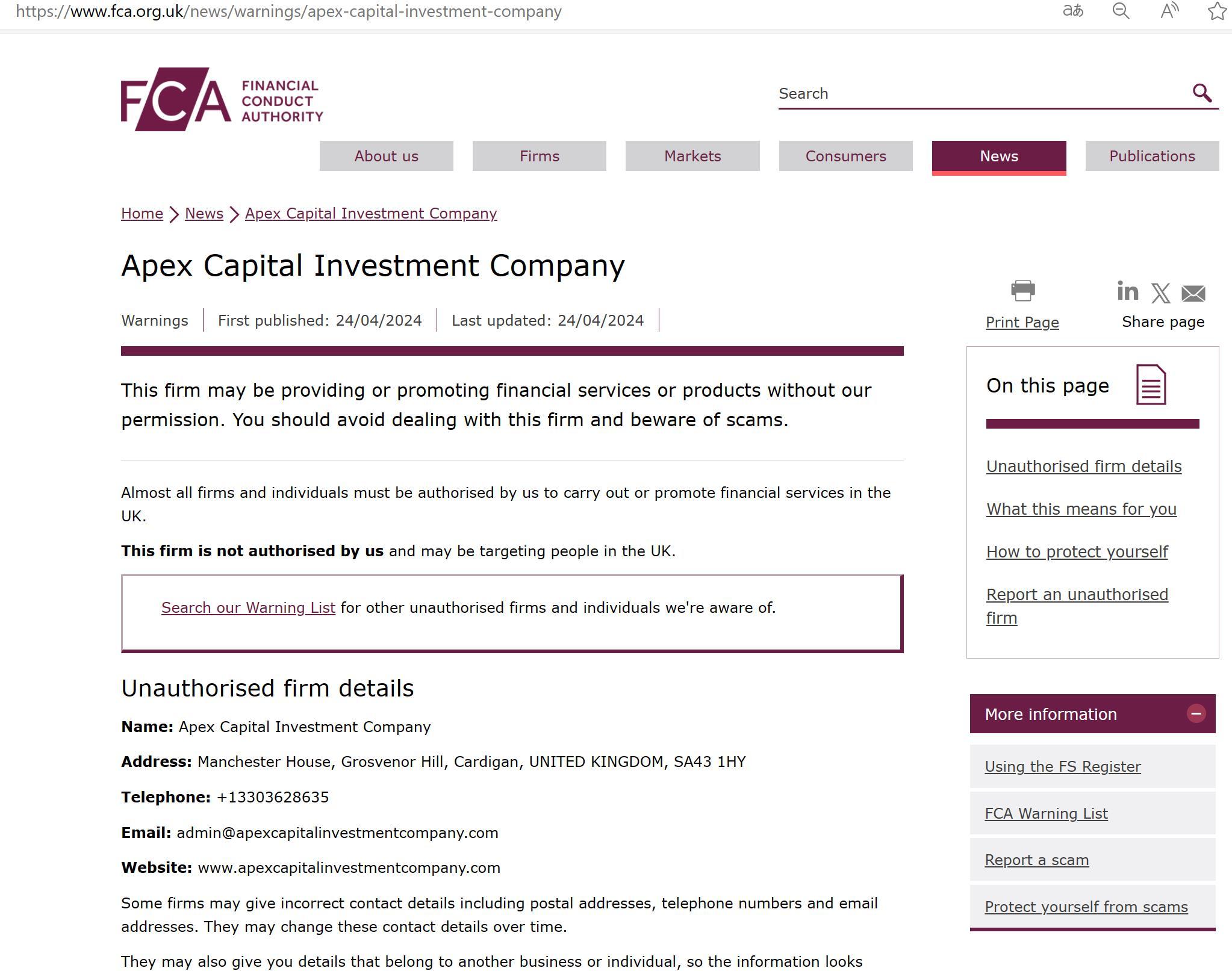 FCA-Warnliste nicht autorisierter Firmen Apex Capital Investment Company.