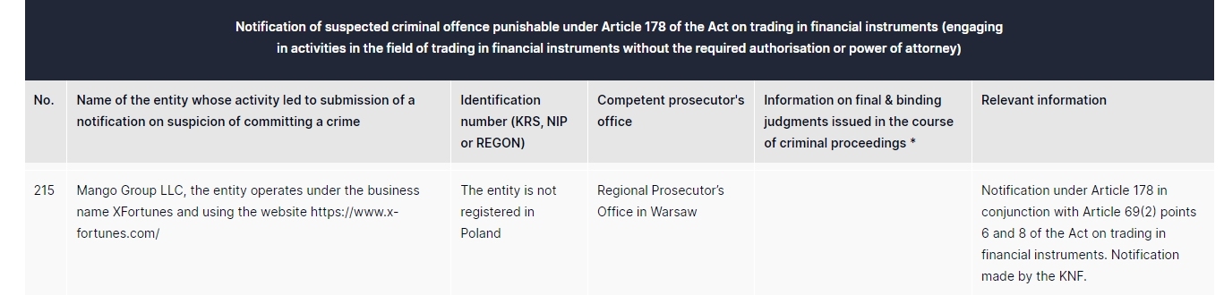 Mango Group LLCDas Unternehmen firmiert unter dem Firmennamen XFortunes und Nutzung der Website https://www.x-fortunes.com/. Das Unternehmen ist in Polen nicht registriert. Regionalstaatsanwaltschaft Warschau. Meldung gemäß Artikel 178 in Verbindung mit Artikel 69(2) Punkte 6 und 8 des Gesetzes über den Handel mit Finanzinstrumenten. Meldung erfolgt durch den KNF.