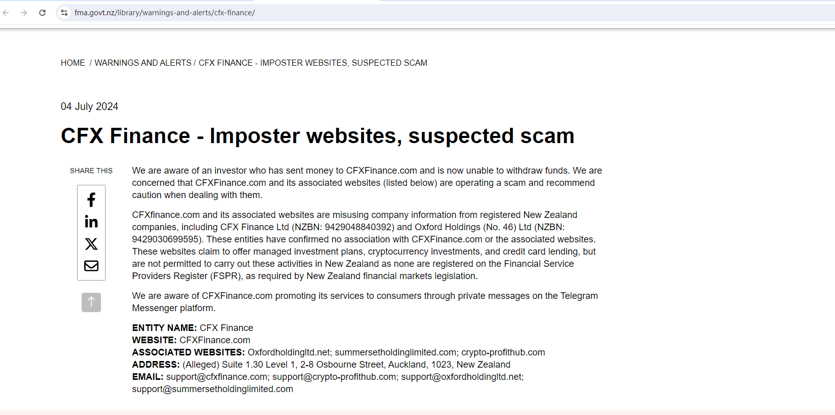 04. Juli 2024 Cfx Finance - Betrüger-Websites, Verdacht auf Betrug. Teilen Sie dies. Uns ist ein Investor bekannt, der Geld an cfxfinance.com gesendet hat und nun kein Geld mehr abheben kann. Wir befürchten, dass cfxfinance.com und die zugehörigen Websites (unten aufgeführt) Betrug betreiben, und empfehlen, im Umgang mit ihnen vorsichtig zu sein. cfxfinance.com und die zugehörigen Websites missbrauchen Unternehmensinformationen von registrierten neuseeländischen Unternehmen, darunter Cfx Finance ltd (nzbn: 9429048840392) und Oxford Holdings (Nr. 46) ltd (nzbn: 9429030699595). Diese Unternehmen haben bestätigt, dass sie in keiner Verbindung mit cfxfinance.com oder den zugehörigen Websites stehen. Diese Websites geben vor, verwaltete Anlagepläne, Investitionen in Kryptowährungen und Kreditkartenkredite anzubieten, dürfen diese Aktivitäten jedoch in Neuseeland nicht durchführen, da keine von ihnen im Register der Finanzdienstleister (FSPR) eingetragen ist, wie es die neuseeländische Finanzmarktgesetzgebung vorschreibt. Wir sind uns bewusst, dass cfxfinance.com seine Dienste Verbrauchern gegenüber über private Nachrichten auf der Messenger-Plattform Telegram bewirbt. Name des Unternehmens: Cfx Finance Website: cfxfinance.com Zugehörige Websites: oxfordholdingltd.net; summersetholdinglimited.com; crypto-profithub.com Adresse: (angeblich) Suite 1.30 Level 1, 2-8 Osbourne Street, Auckland, 1023, Neuseeland E-Mail: support@cfxfinance.com; support@crypto-profithub.com; support@oxfordholdingltd.net; support@summersetholdinglimited.com
