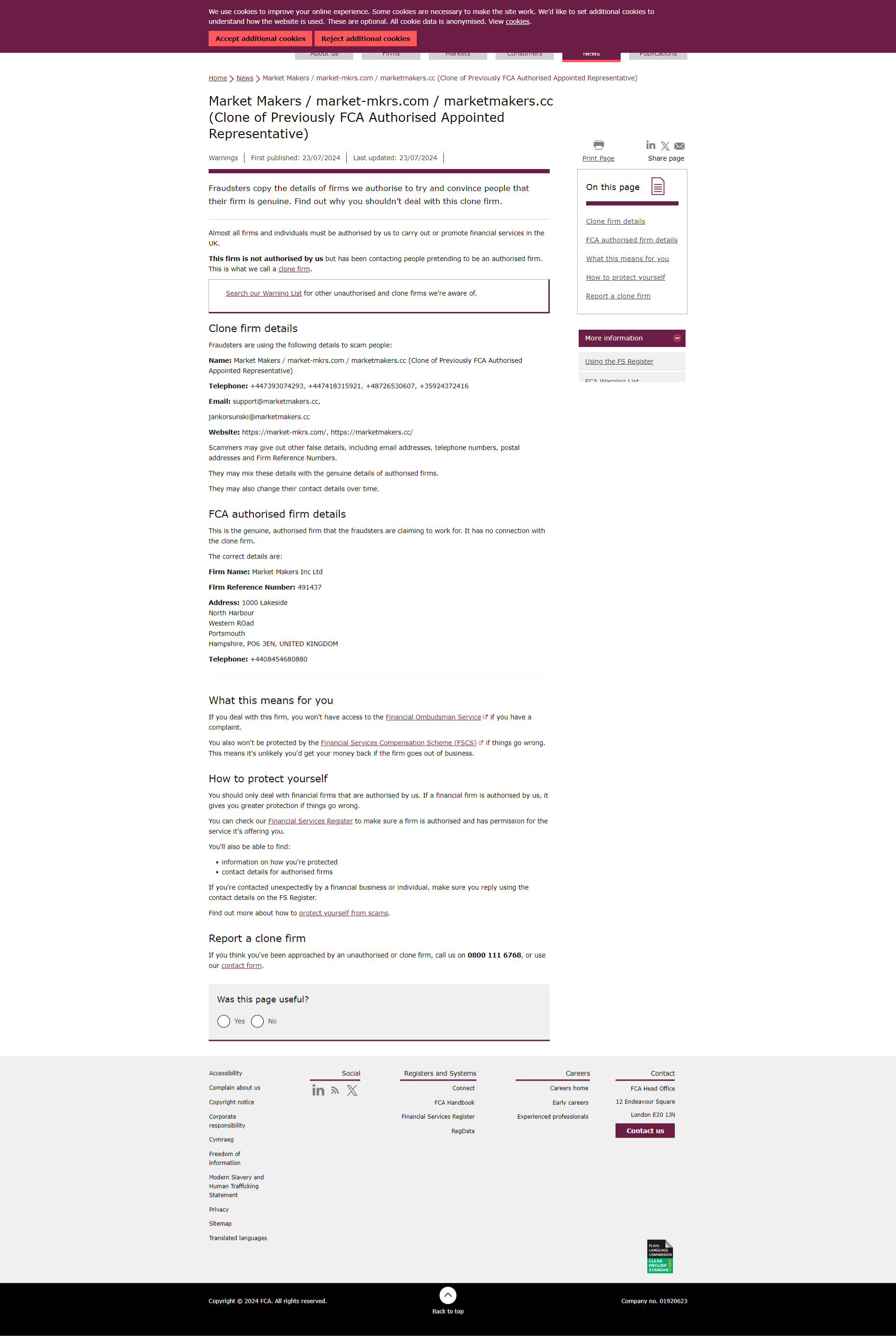 FCA-Warnliste nicht autorisierter Firmen Market Makers / market-mkrs.com / marketmakers.cc (Klon eines zuvor von der FCA autorisierten Appointed Representative).