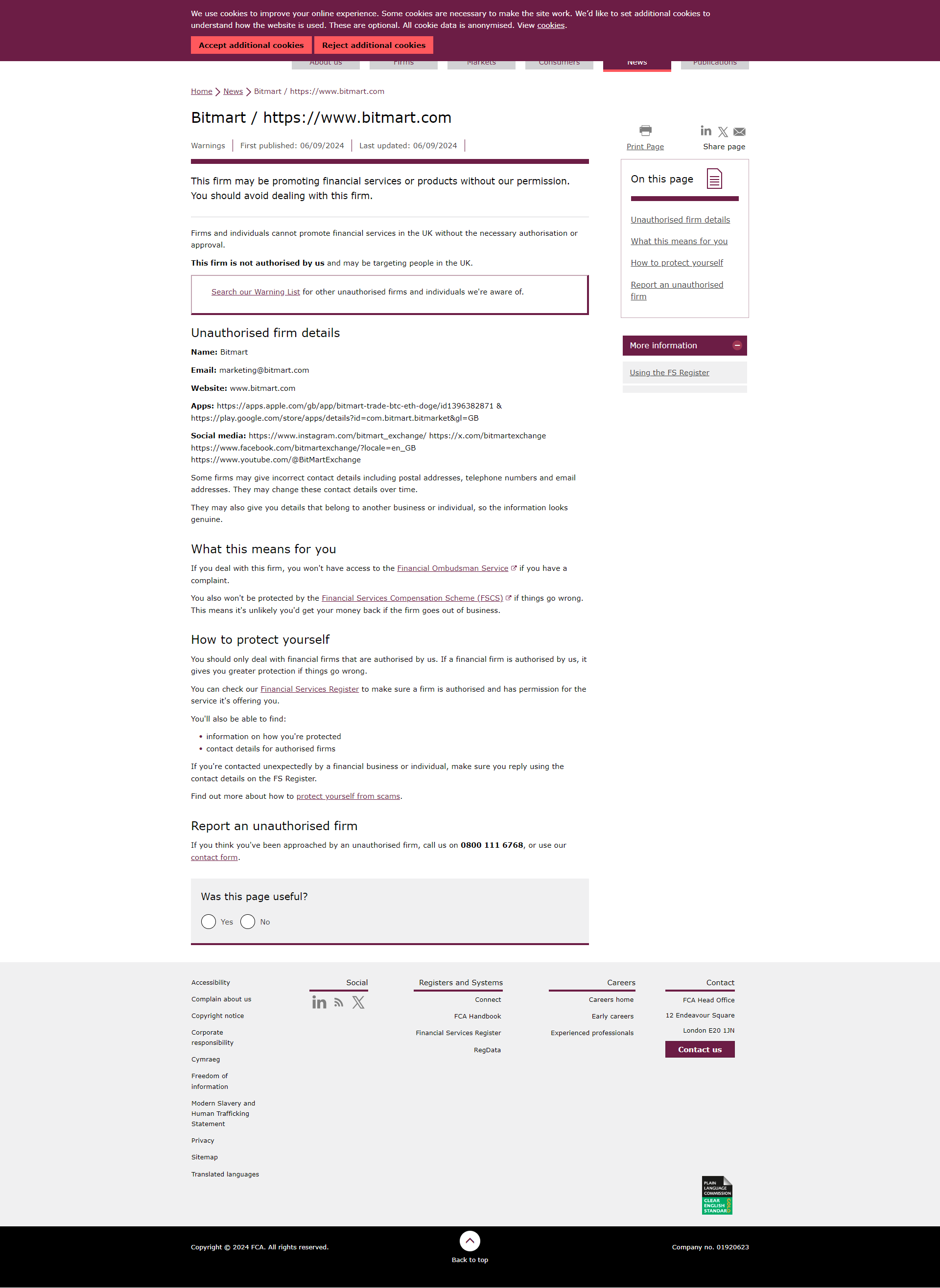 FCA-Warnliste nicht autorisierter Firmen Bitmart / https://www.bitmart.com.
