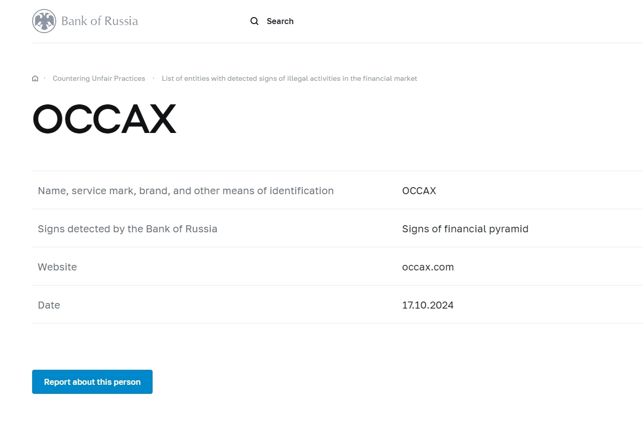 Name, Dienstleistungsmarke, Marke und andere Identifikationsmittel Occax Zeichen, die von der Bank von Russland entdeckt wurden Zeichen einer Finanzpyramide-Website Occax .com Datum 17.10.2024