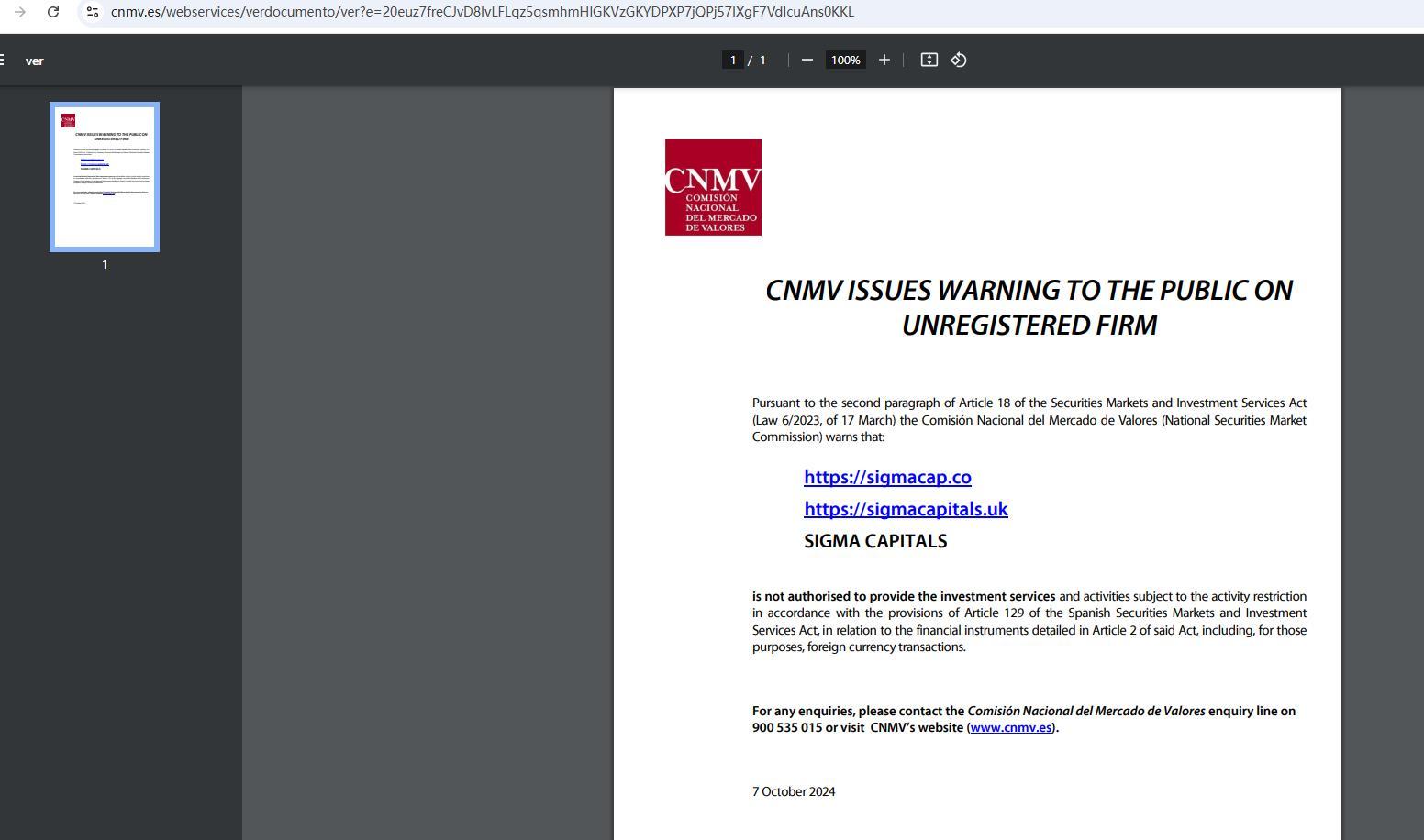 CNV gibt gemäß Artikel 18 Absatz 2 des Gesetzes über Wertpapiermärkte und Investmentdienstleistungen (Gesetz 6/2023 vom 17. März) eine öffentliche Warnung zu nicht registrierten Unternehmen heraus. Die Comisión Nacional del Mercado de Valores (Nationale Wertpapiermarktkommission) warnt: https://sigmacap.co https://sigmacapitals.uk Sigma Capital s ist nicht befugt, die Anlagedienstleistungen und -aktivitäten zu erbringen, die der Aktivitätsbeschränkung gemäß den Bestimmungen von Artikel 129 des spanischen Gesetzes über Wertpapiermärkte und Anlagedienstleistungen in Bezug auf die in Artikel 2 dieses Gesetzes aufgeführten Finanzinstrumente unterliegen, einschließlich, für diese Zwecke, Devisentransaktionen. Bei Anfragen wenden Sie sich bitte an die Auskunftsstelle der Comisión Nacional del Mercado de Valores unter 900 535 015 oder besuchen Sie die Website der CNMV (www.cnmv.es). 7. Oktober 2024