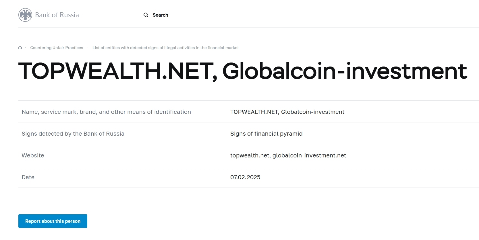 Name, Dienstleistungsmarke, Marke und andere Identifikationsmittel topwealth.net , Globalcoin-Investment-Zeichen von der Bank von Russland entdeckt Zeichen einer Finanzpyramiden-Website topwealth.net , globalcoin-investment.net Datum 07.02.2025