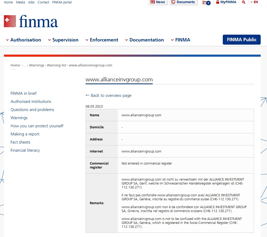 www. Allianceinvgroup.com non è da confondere con Alliance Investment Group sa, ginevra, inscritta nel registro di commercio svizzero (che-112.130.271).