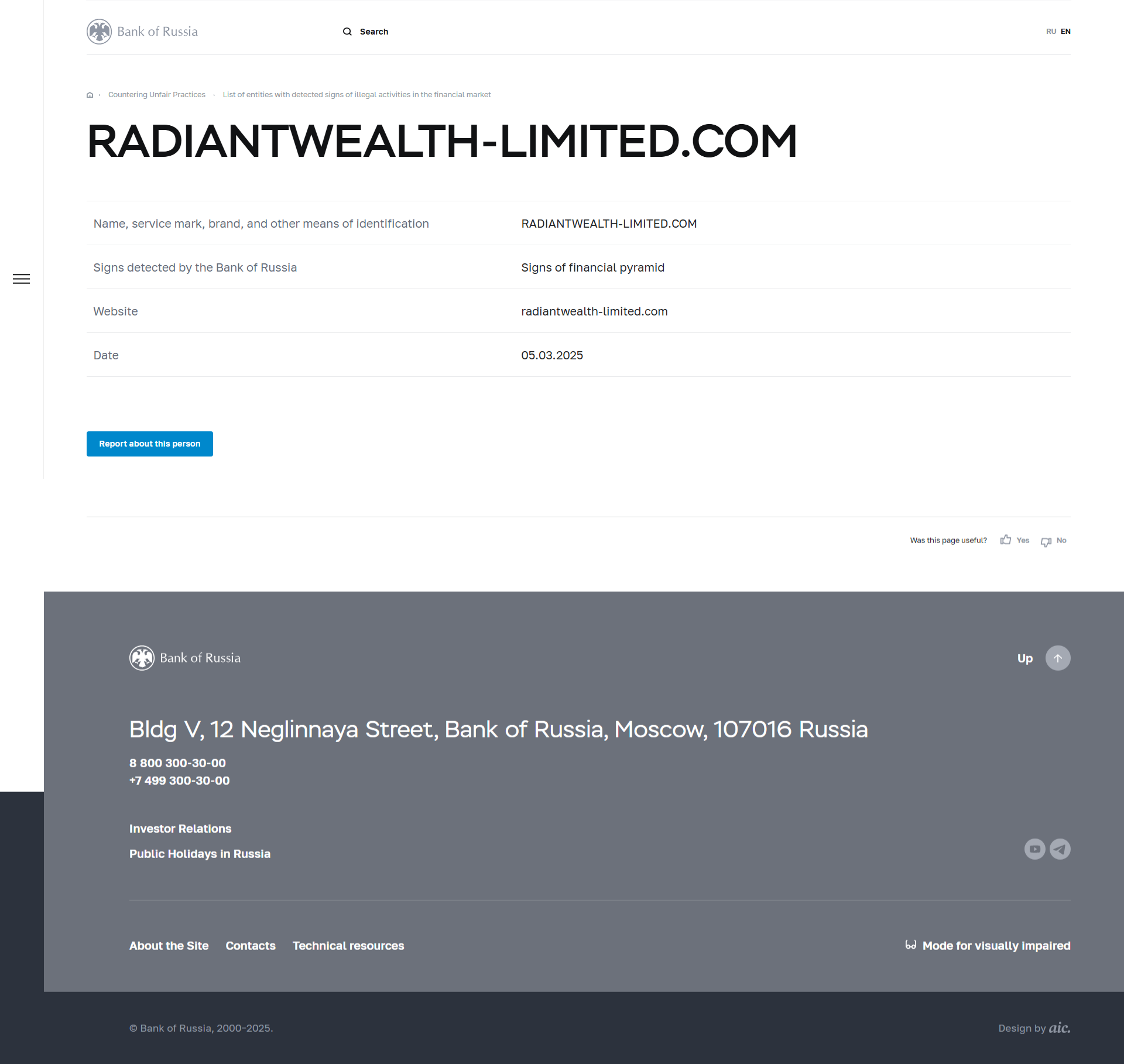 Name, Dienstleistungsmarke, Marke und andere Identifikationsmittel RADIANTWEALTH-LIMITED.COM Von der Bank von Russland erkannte Zeichen Zeichen einer Finanzpyramide Website radiantwealth-limited.com Datum 05.03.2025